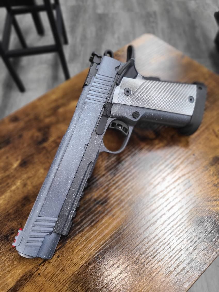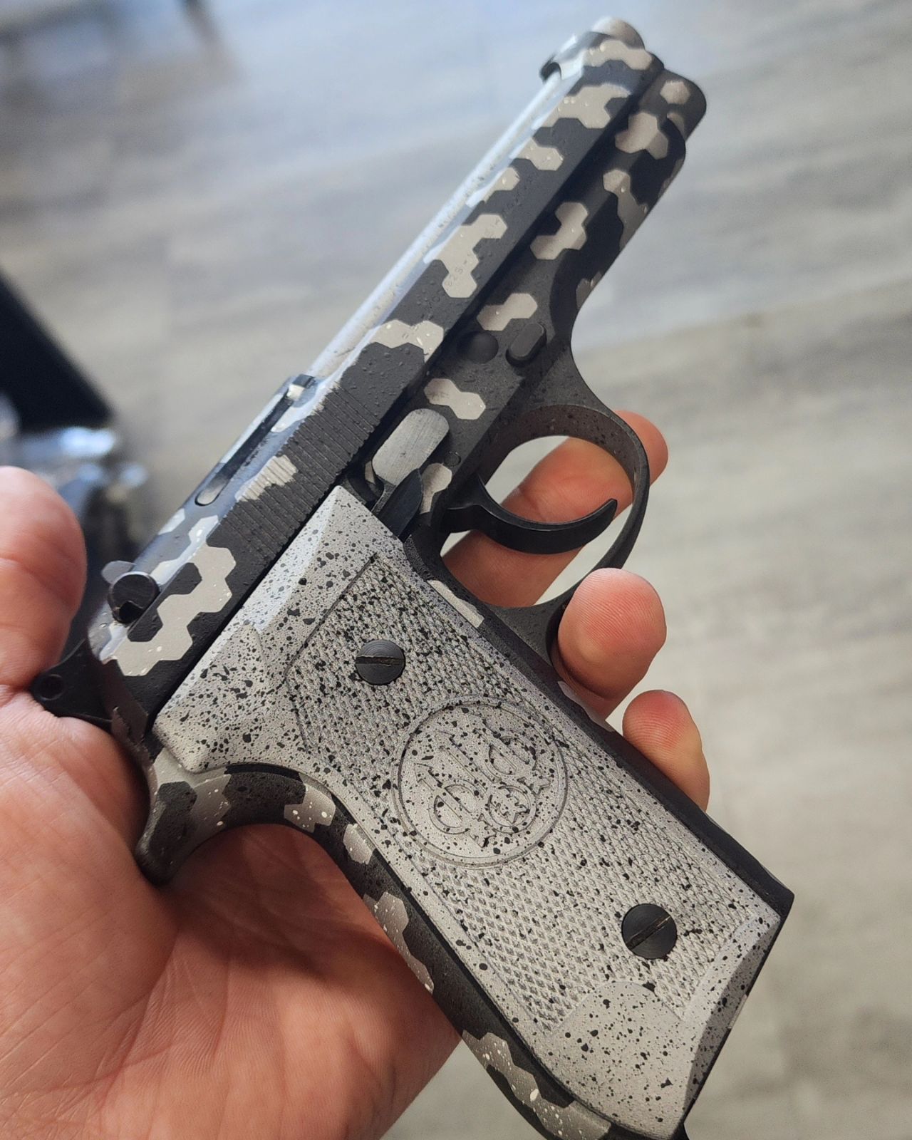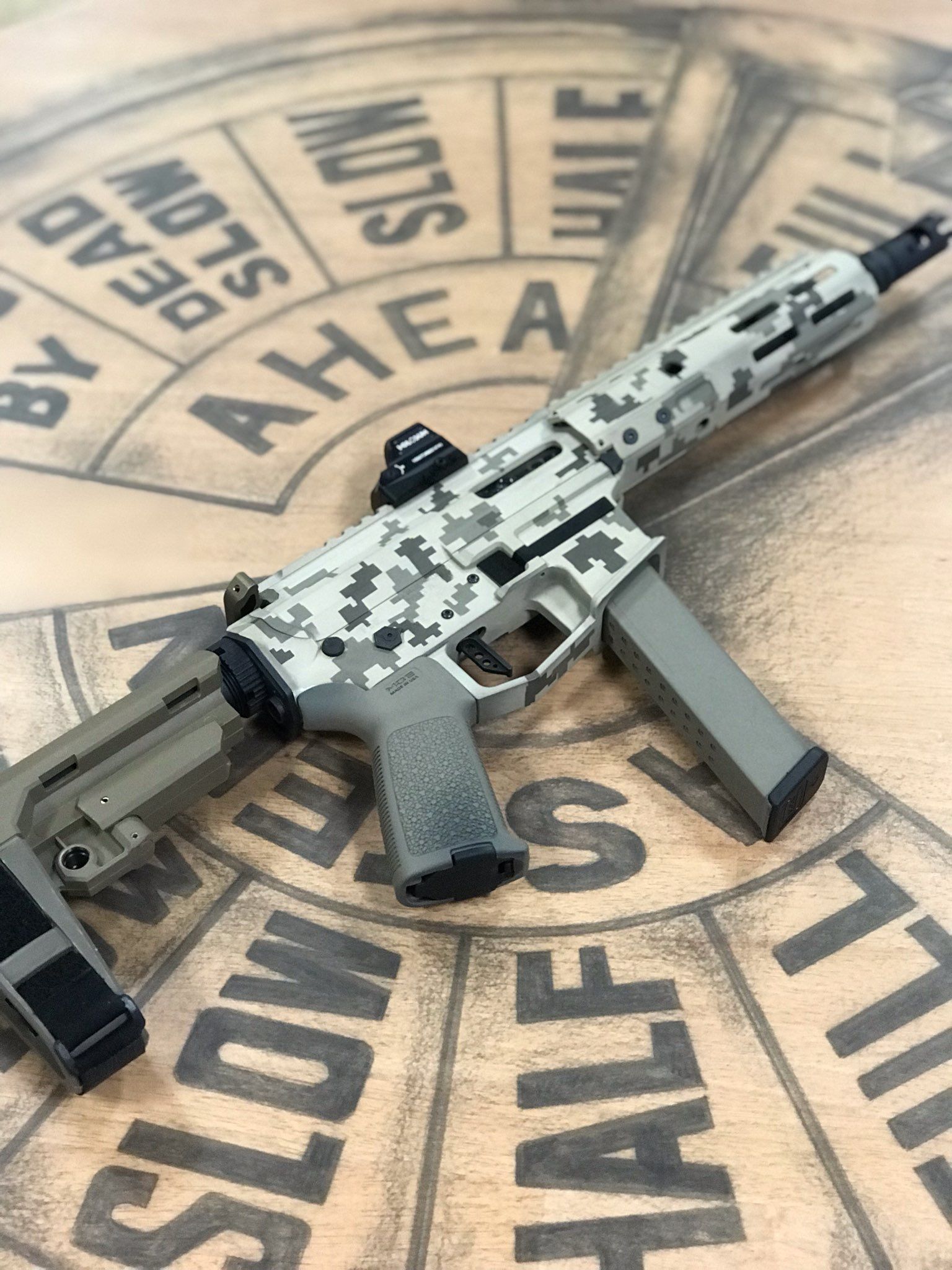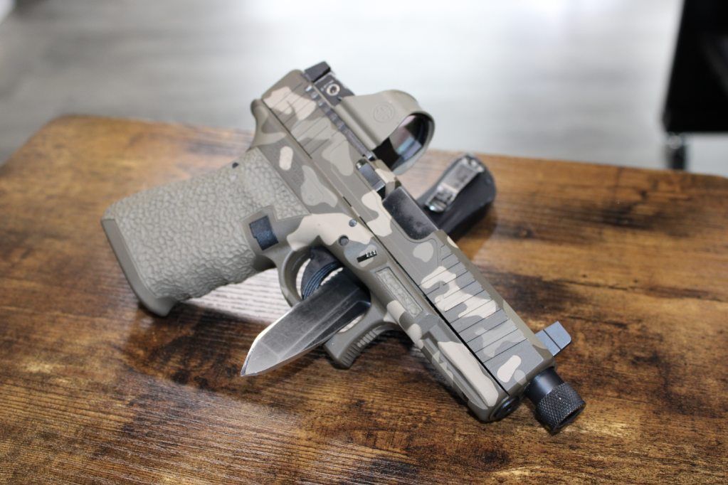 Hand holding a custom camouflage pistol with a red dot sight and flashlight.