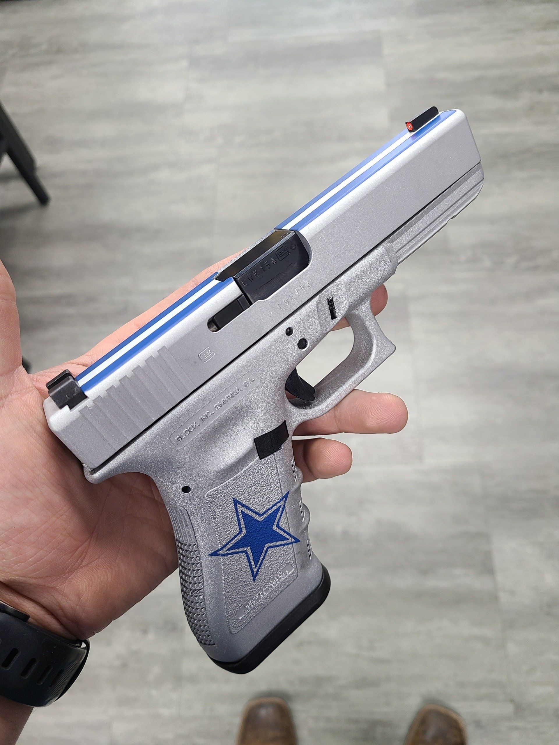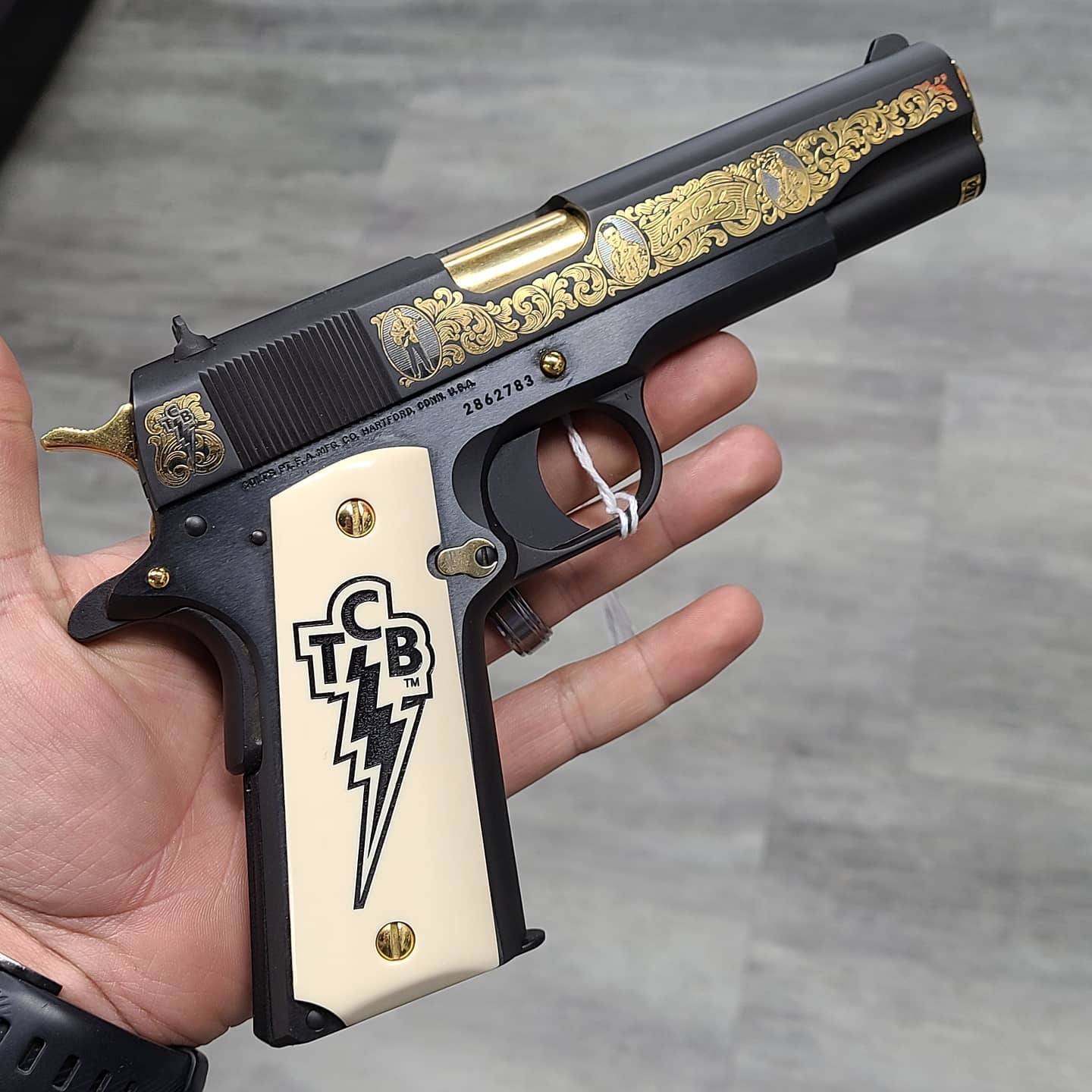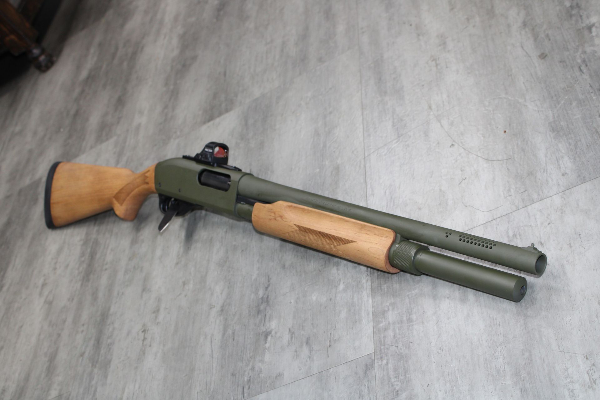 Hand holding a custom camouflage pistol with a red dot sight and flashlight.