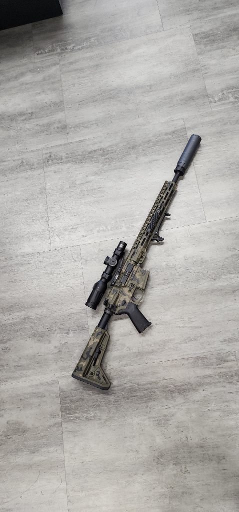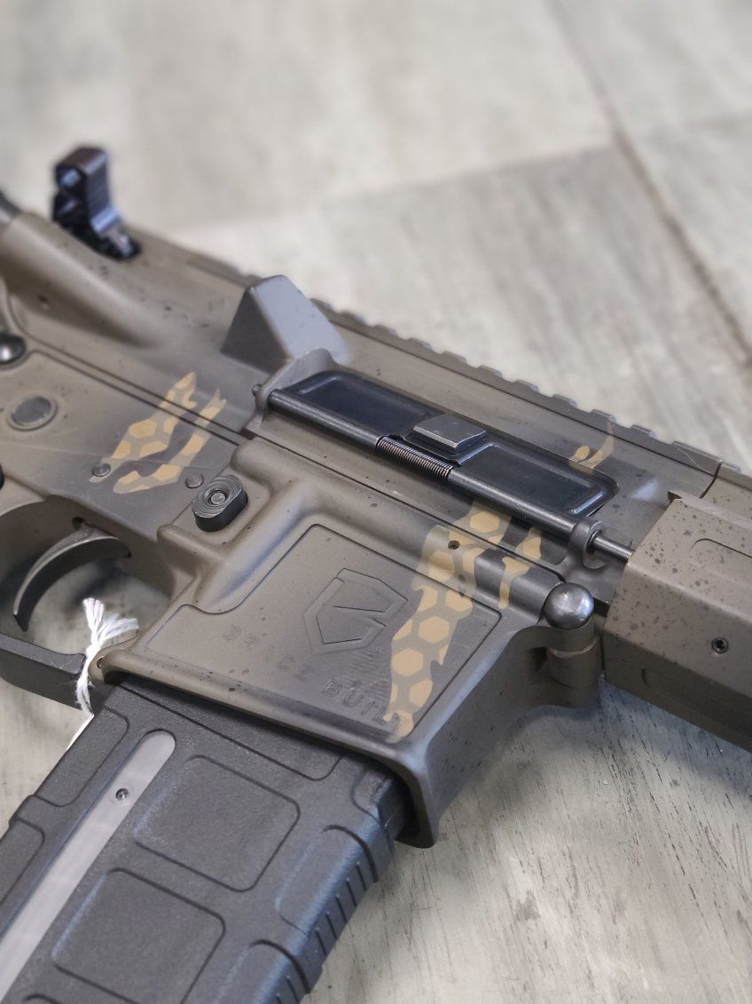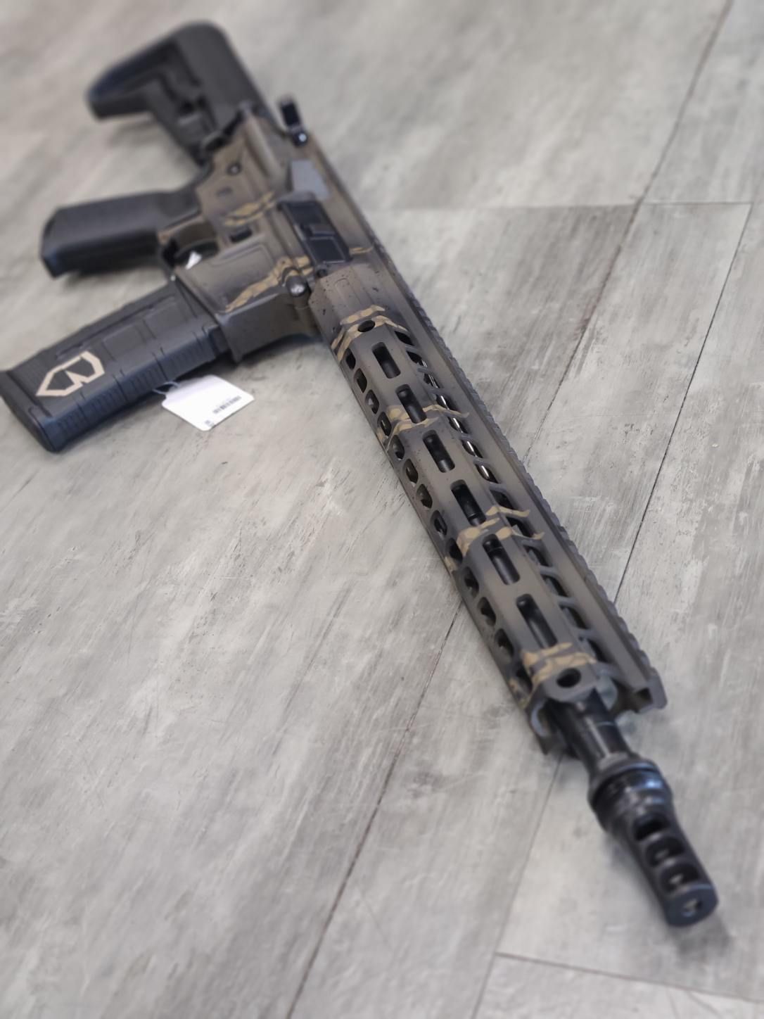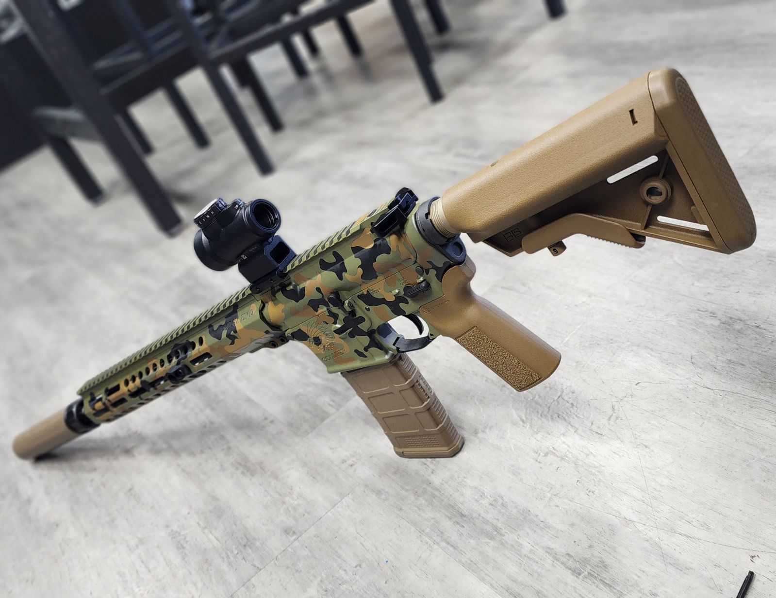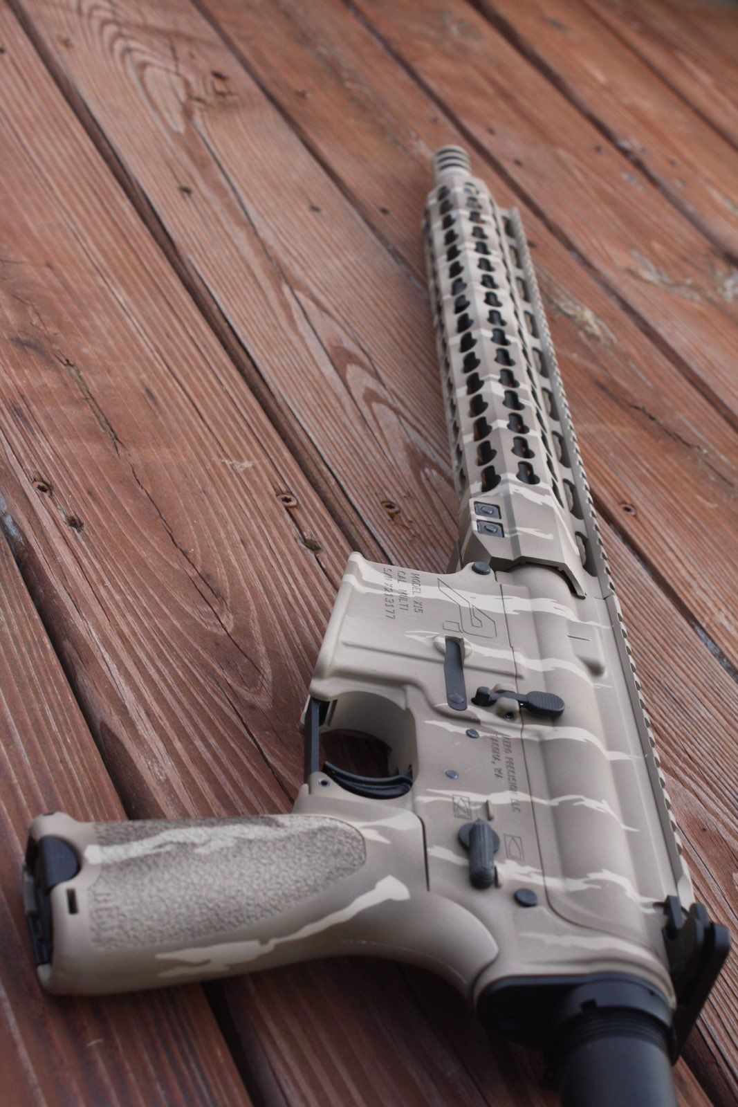 Tan and black AR-15 rifle with accessories, set on a gray wood floor.