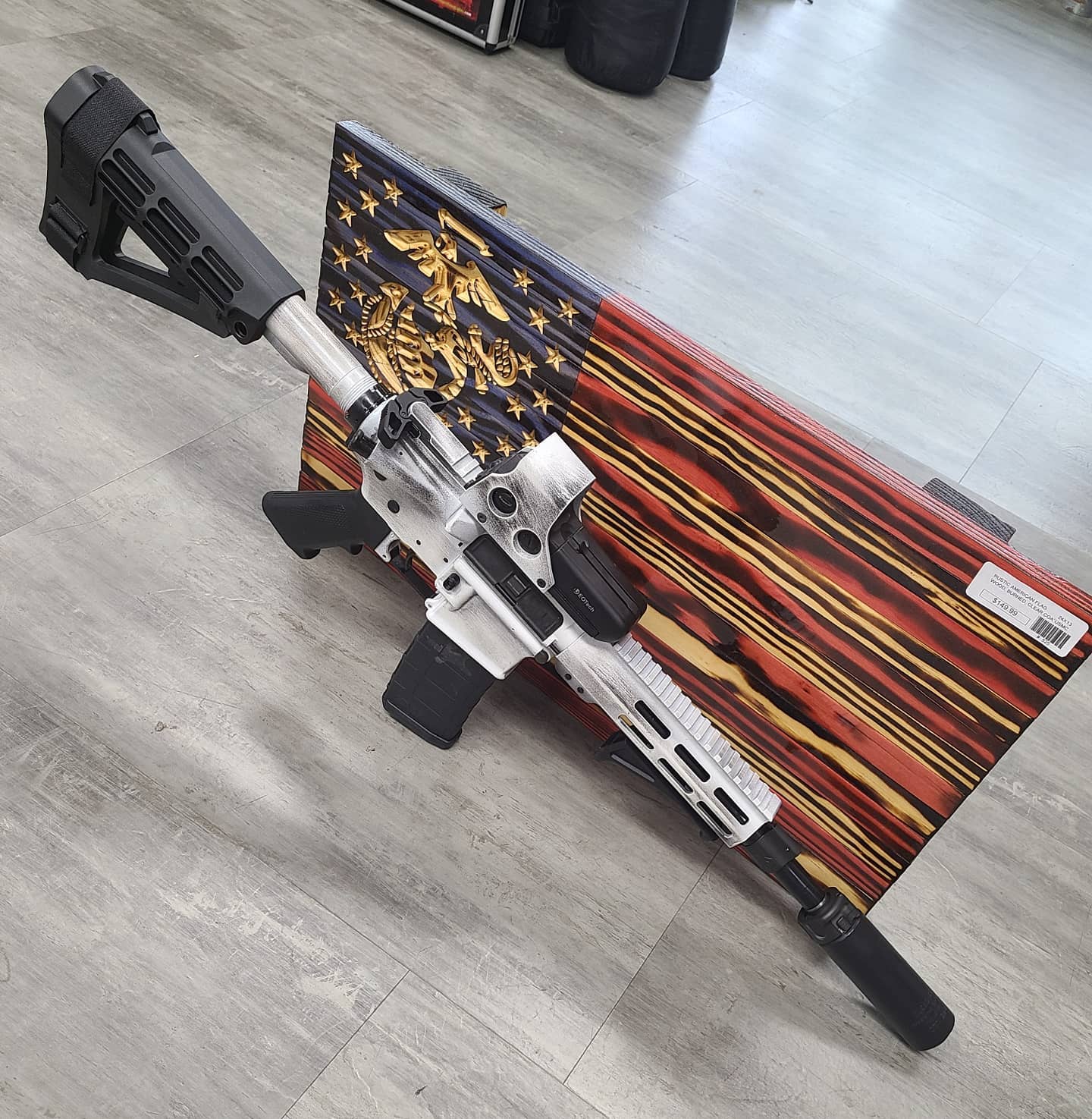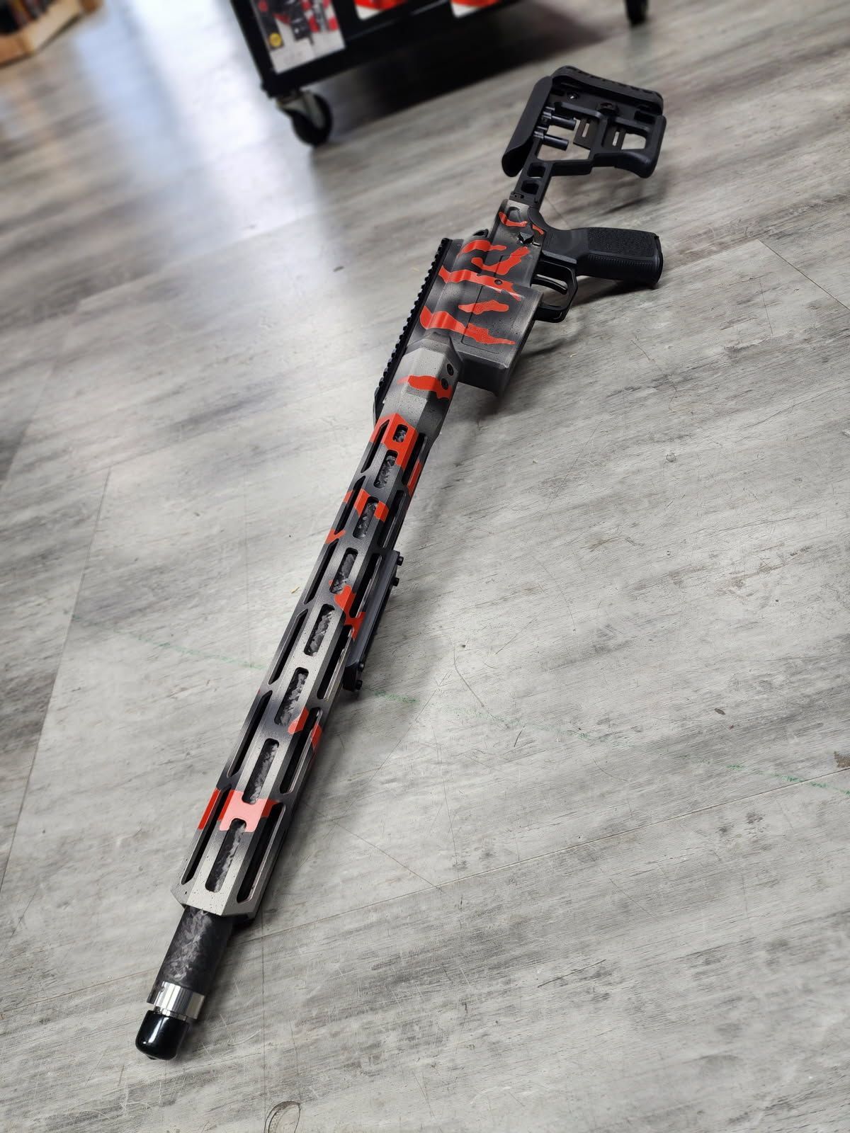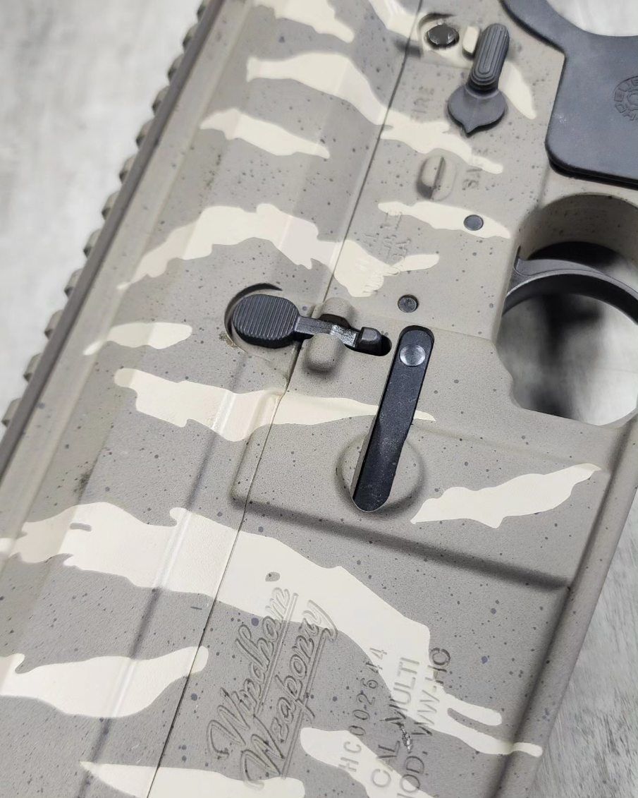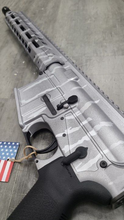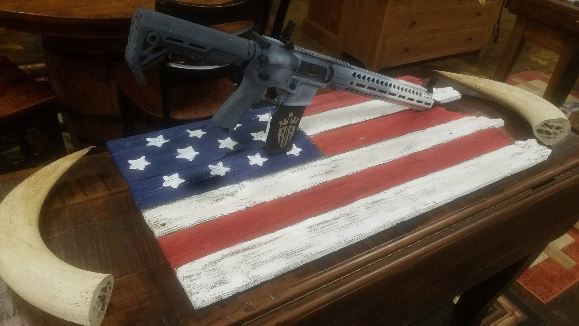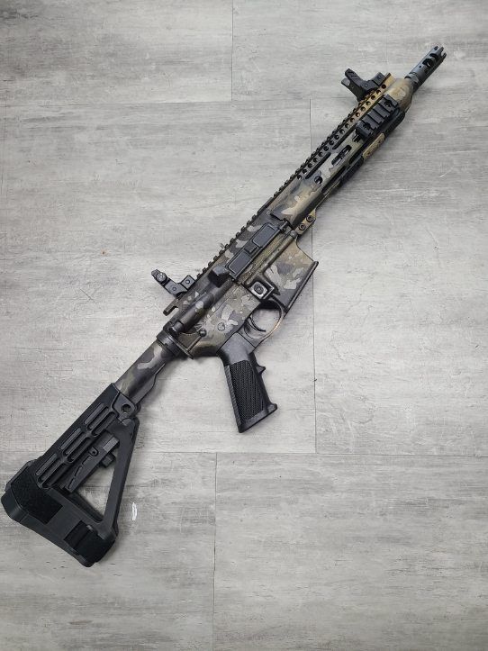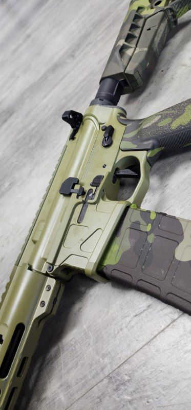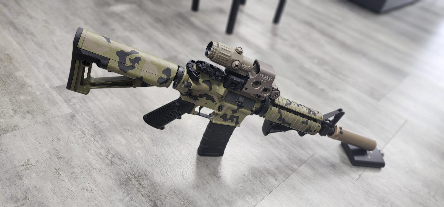 Tan and black AR-15 rifle with accessories, set on a gray wood floor.