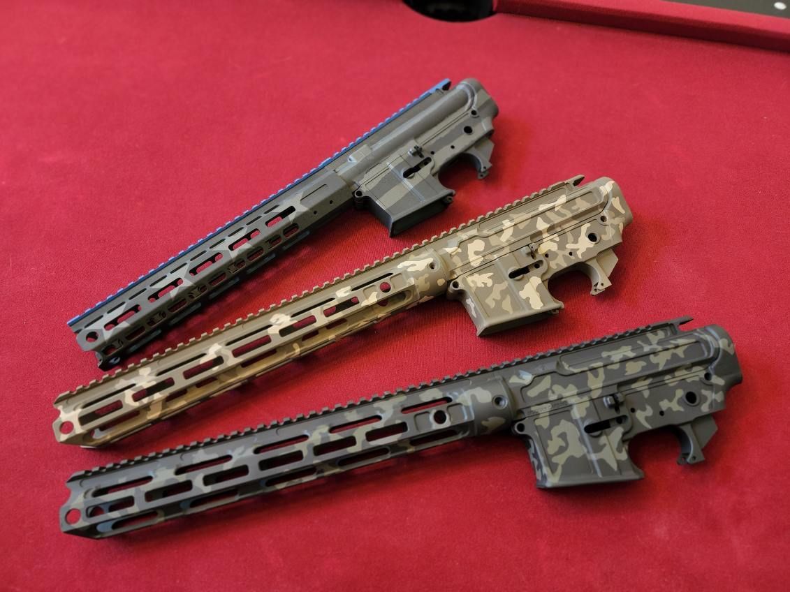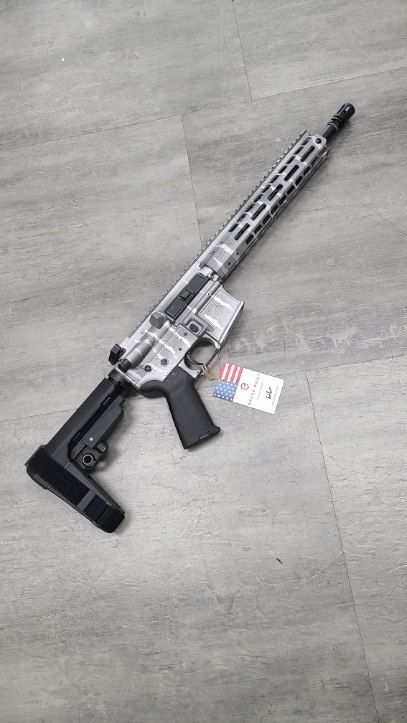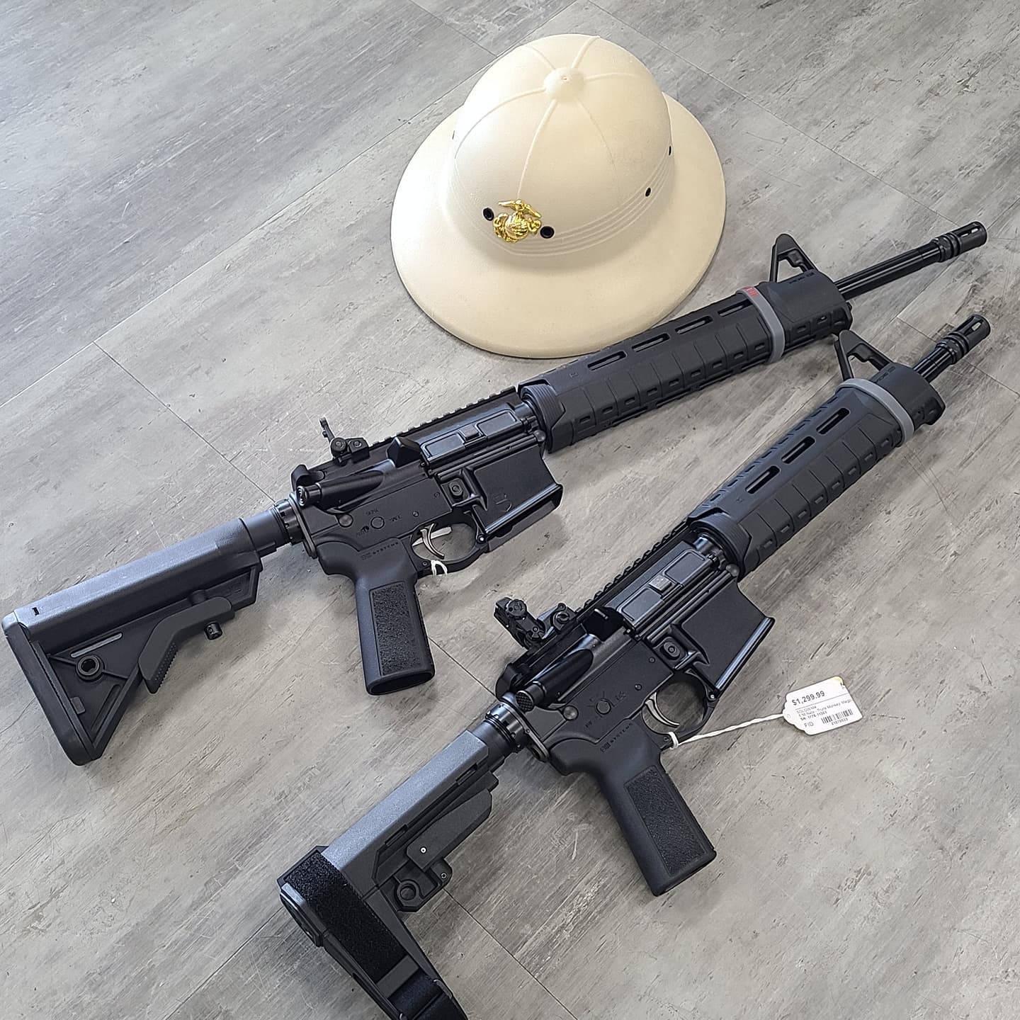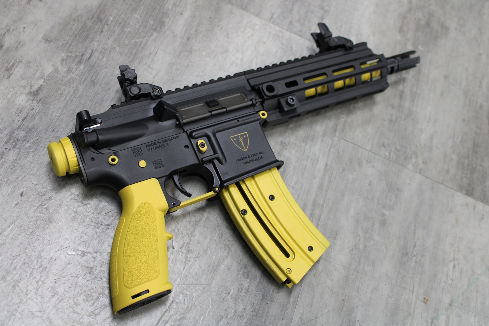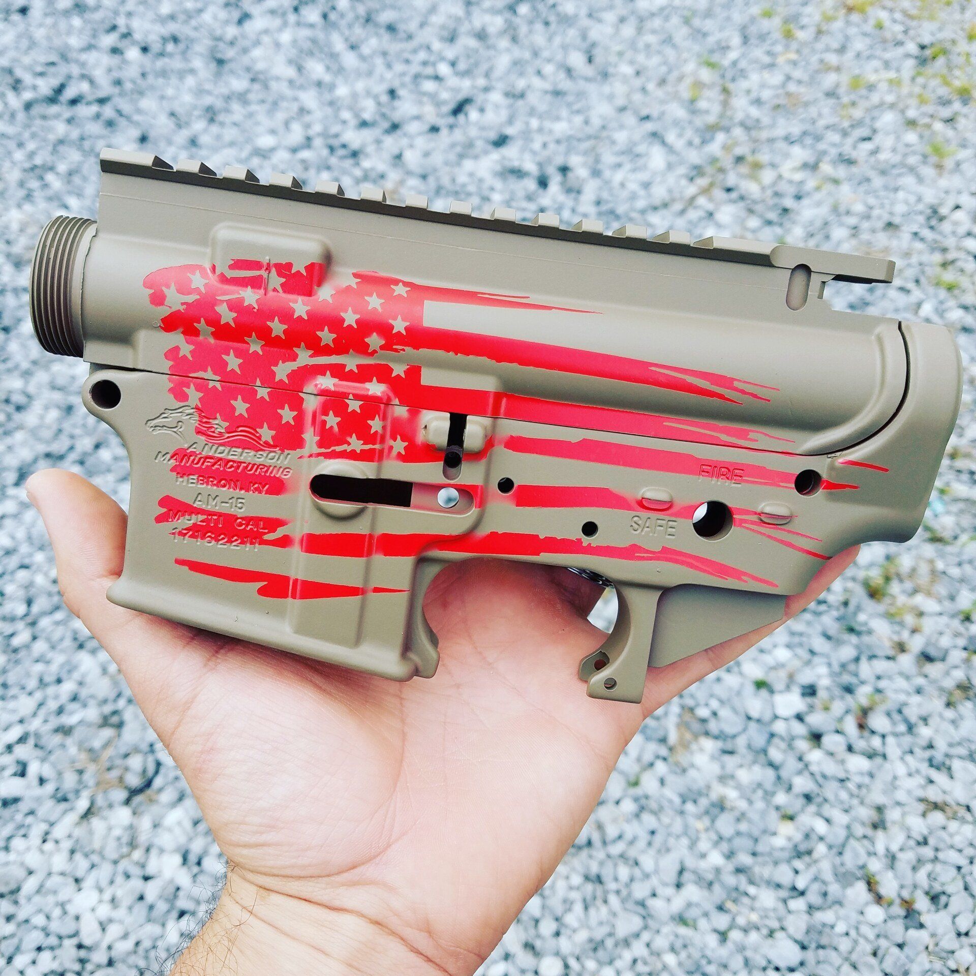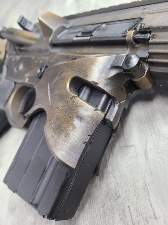 Tan and black AR-15 rifle with accessories, set on a gray wood floor.