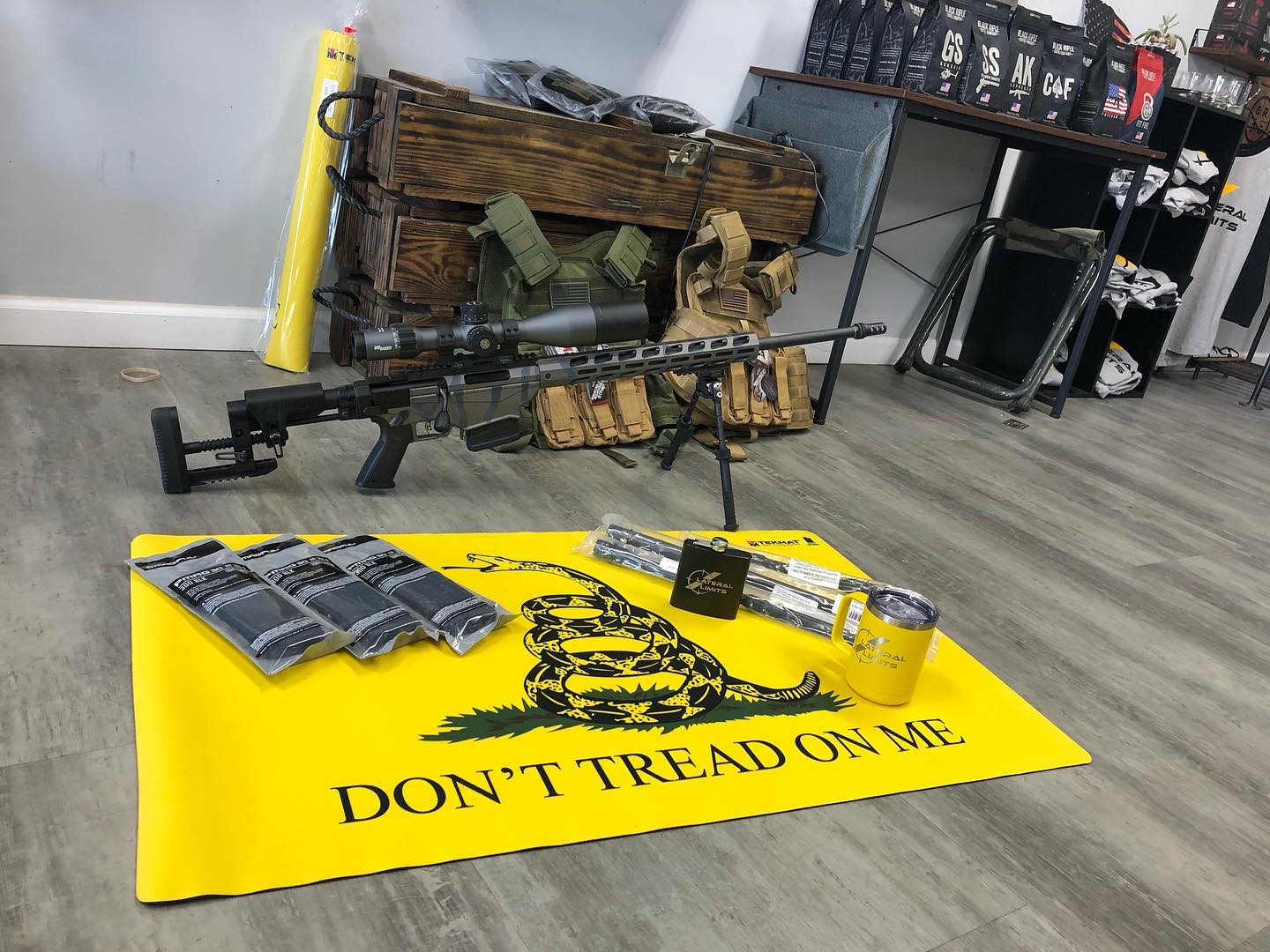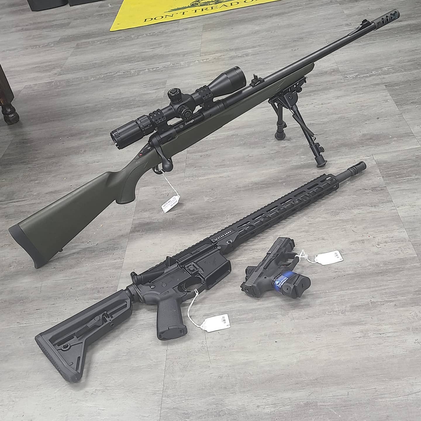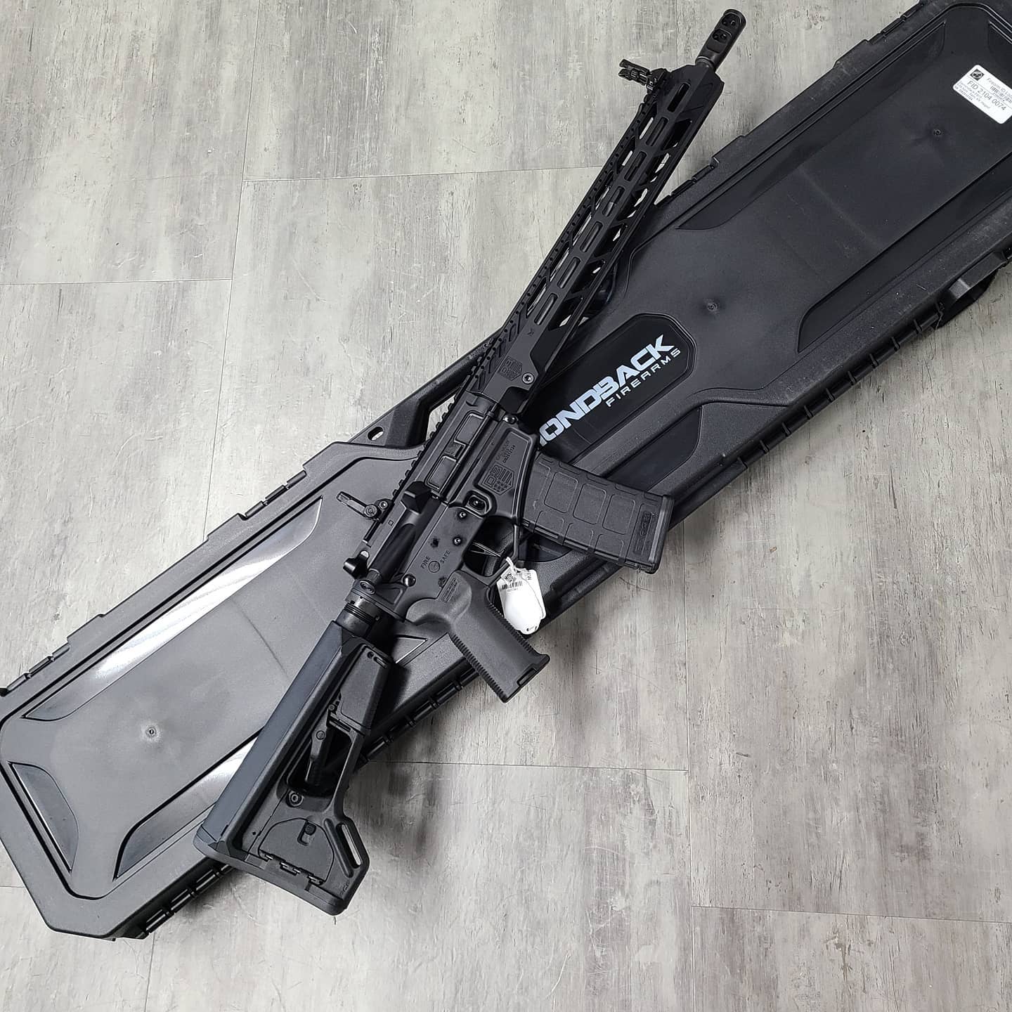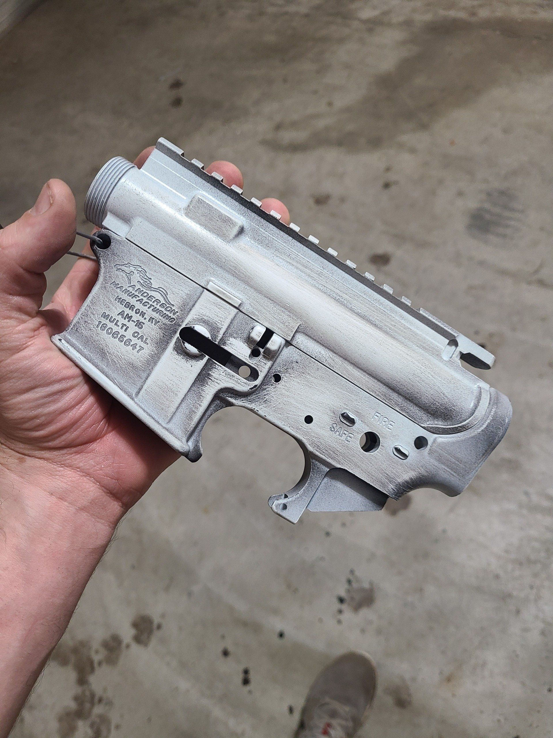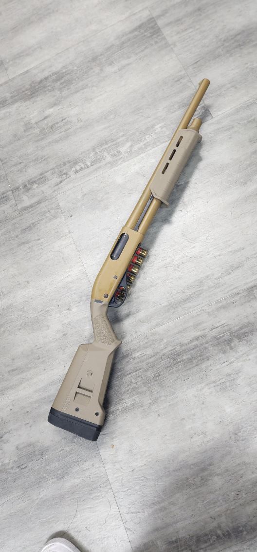 Tan and black AR-15 rifle with accessories, set on a gray wood floor.