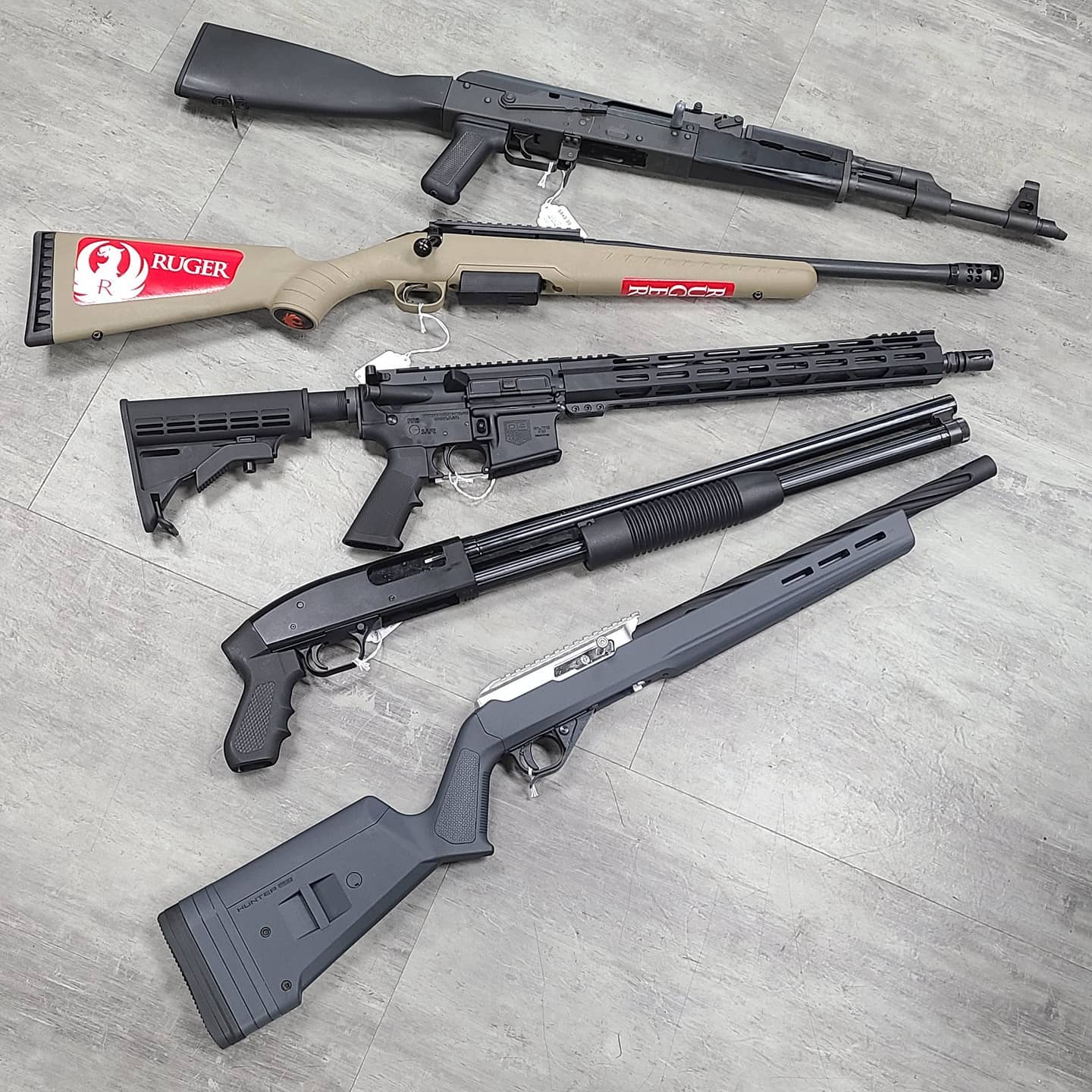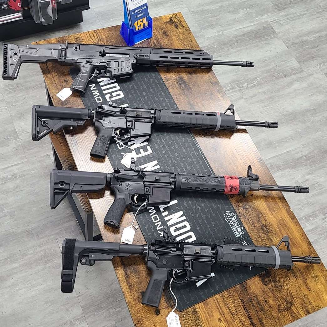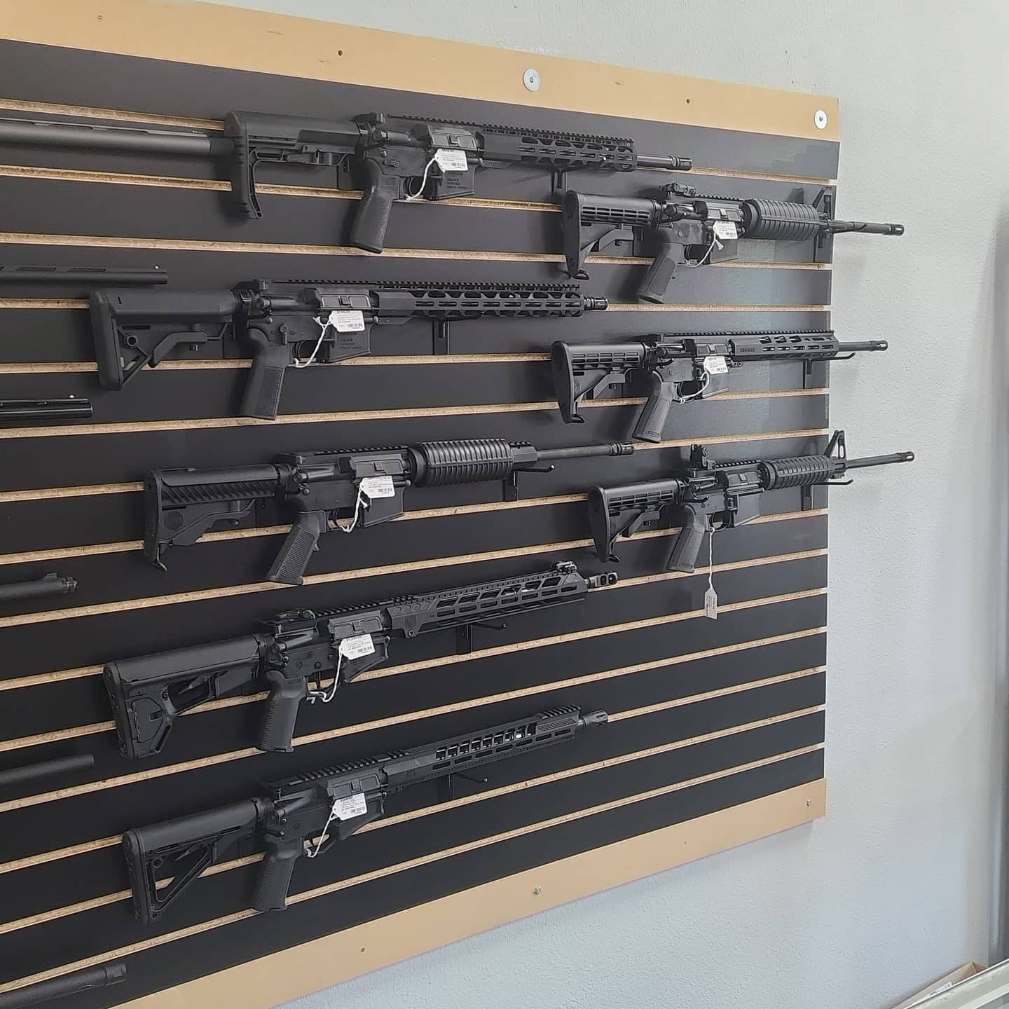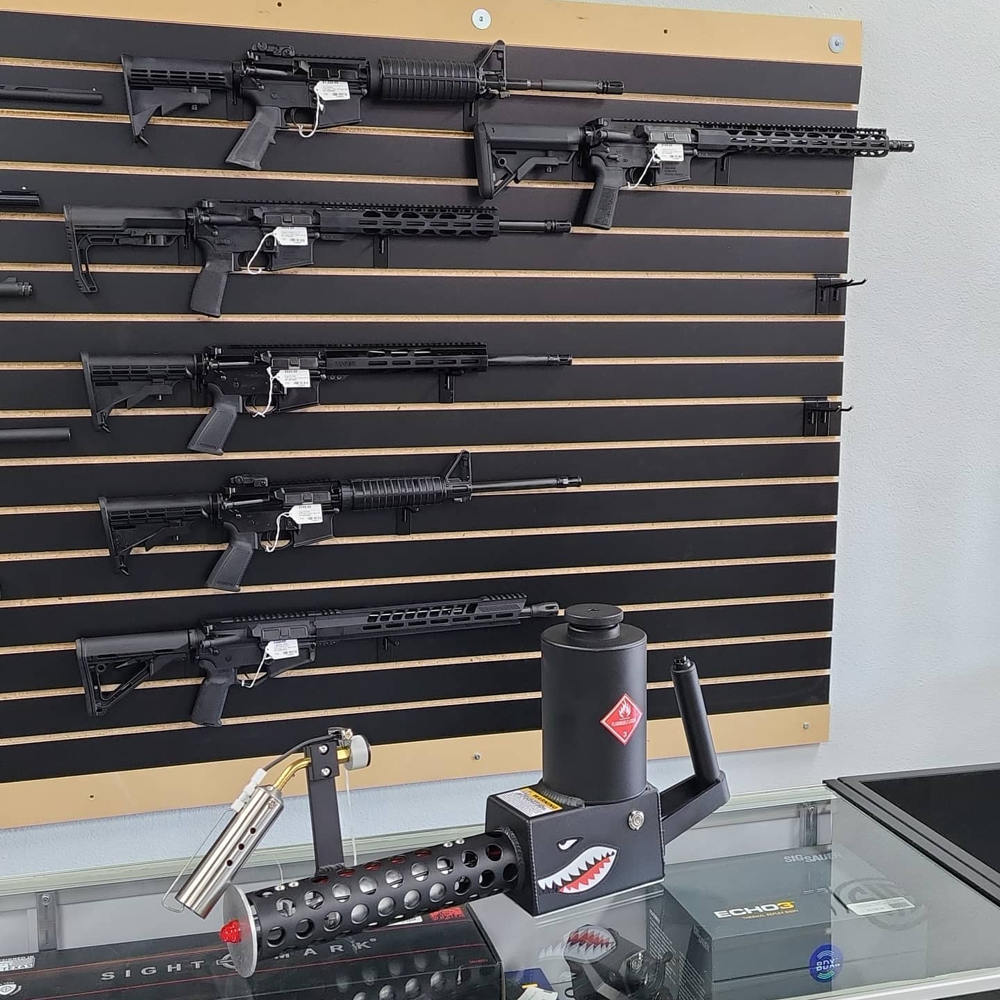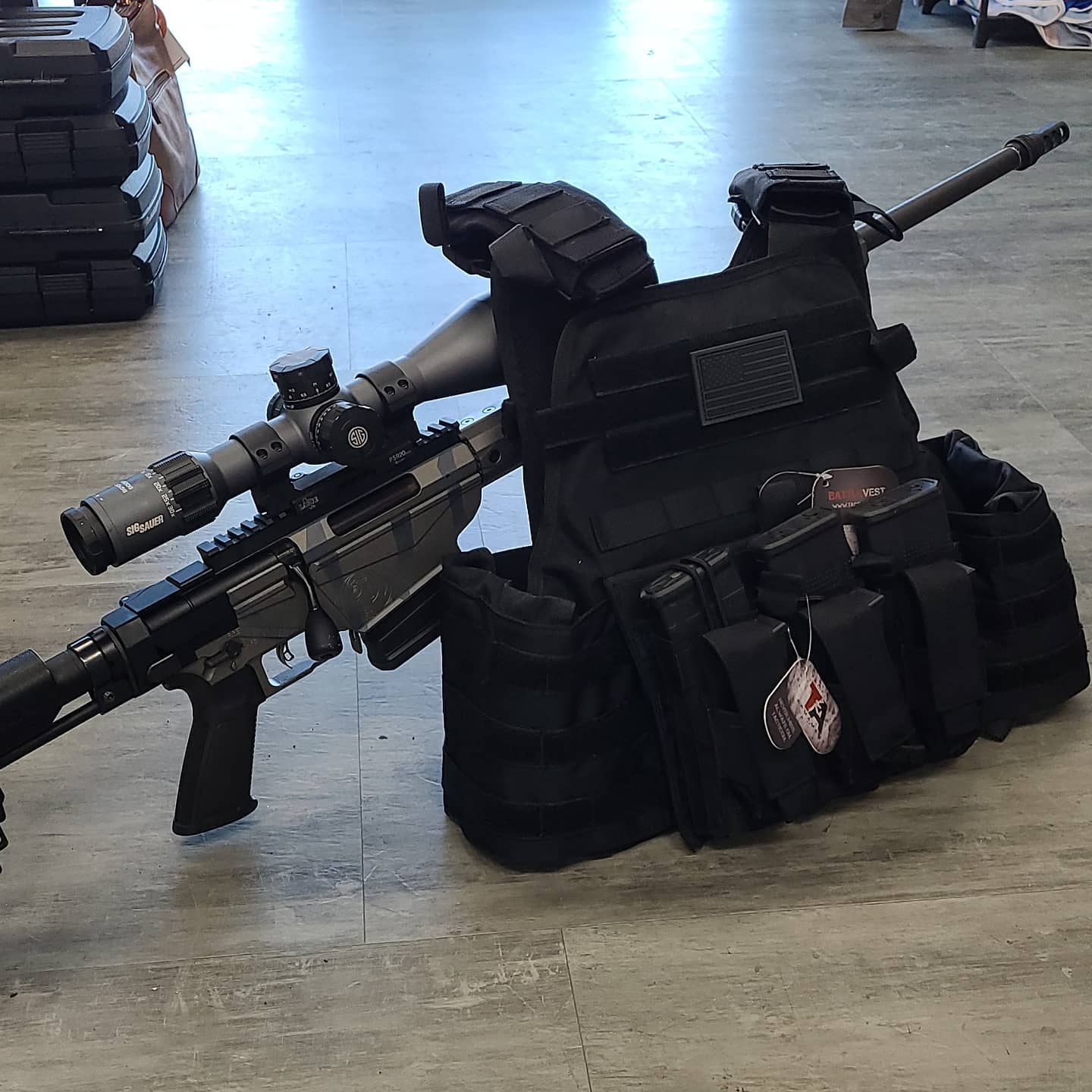 Tan and black AR-15 rifle with accessories, set on a gray wood floor.