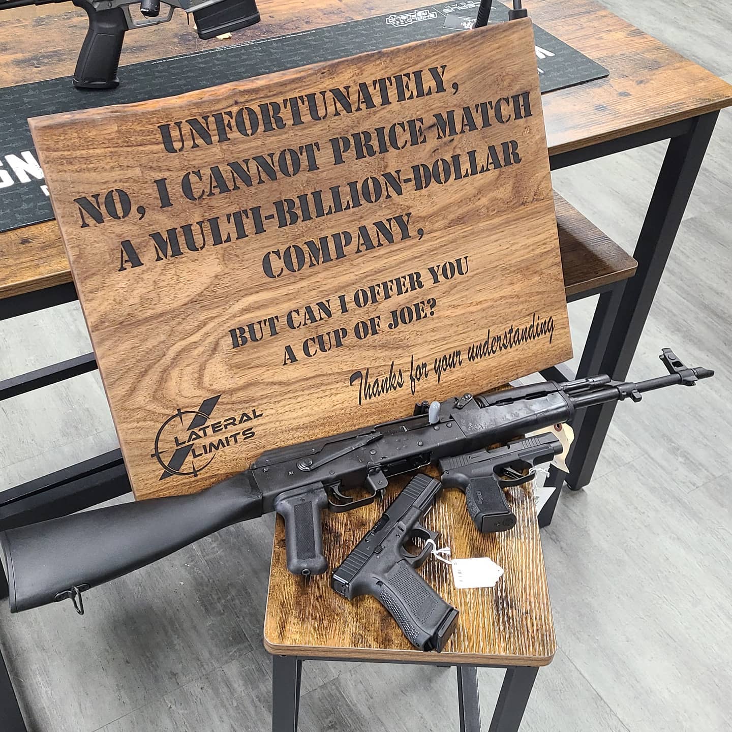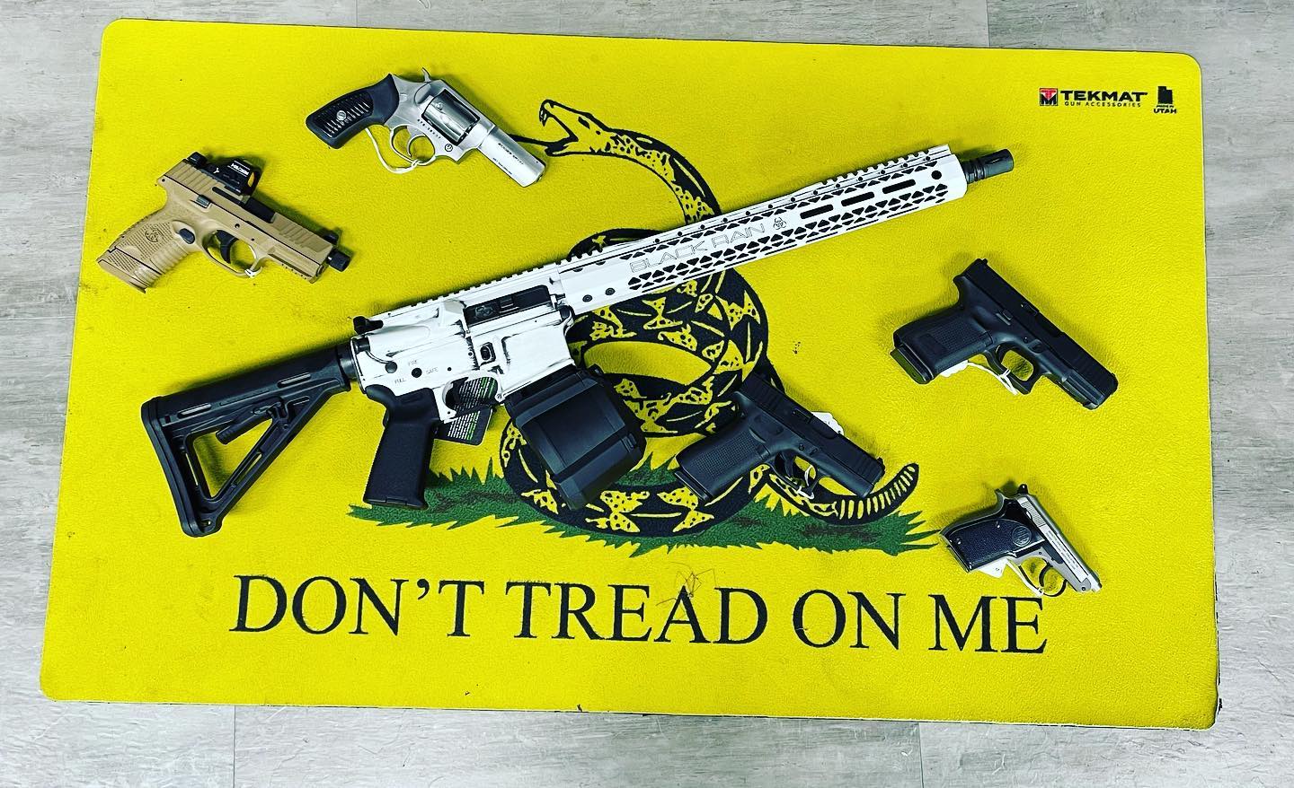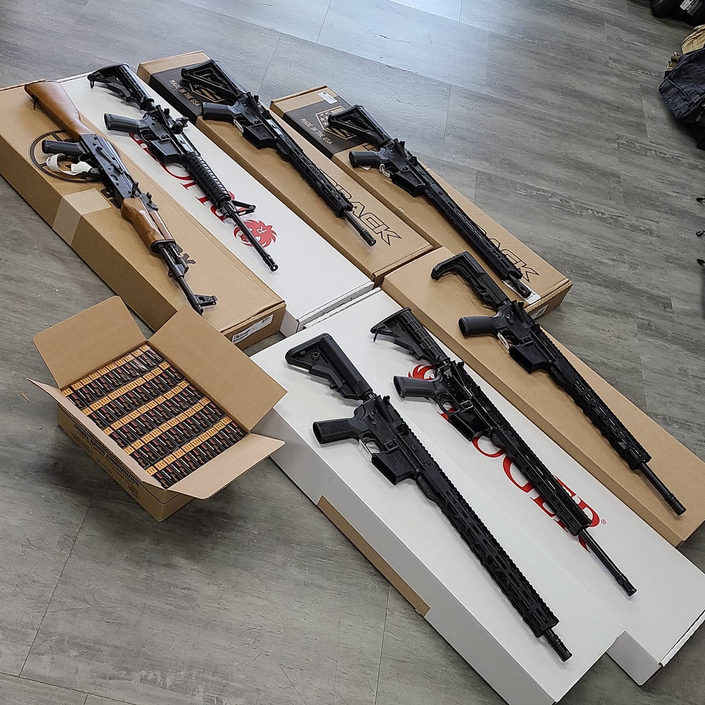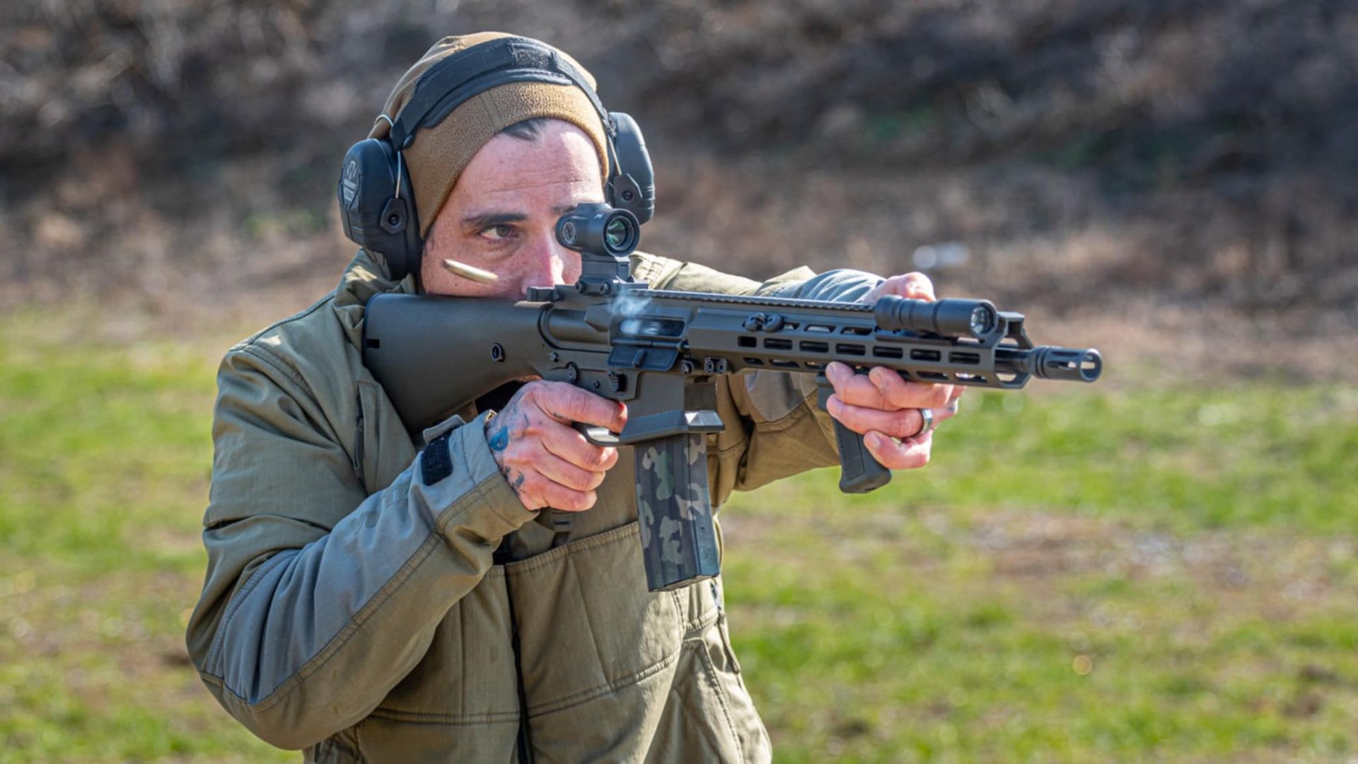 Tan and black AR-15 rifle with accessories, set on a gray wood floor.