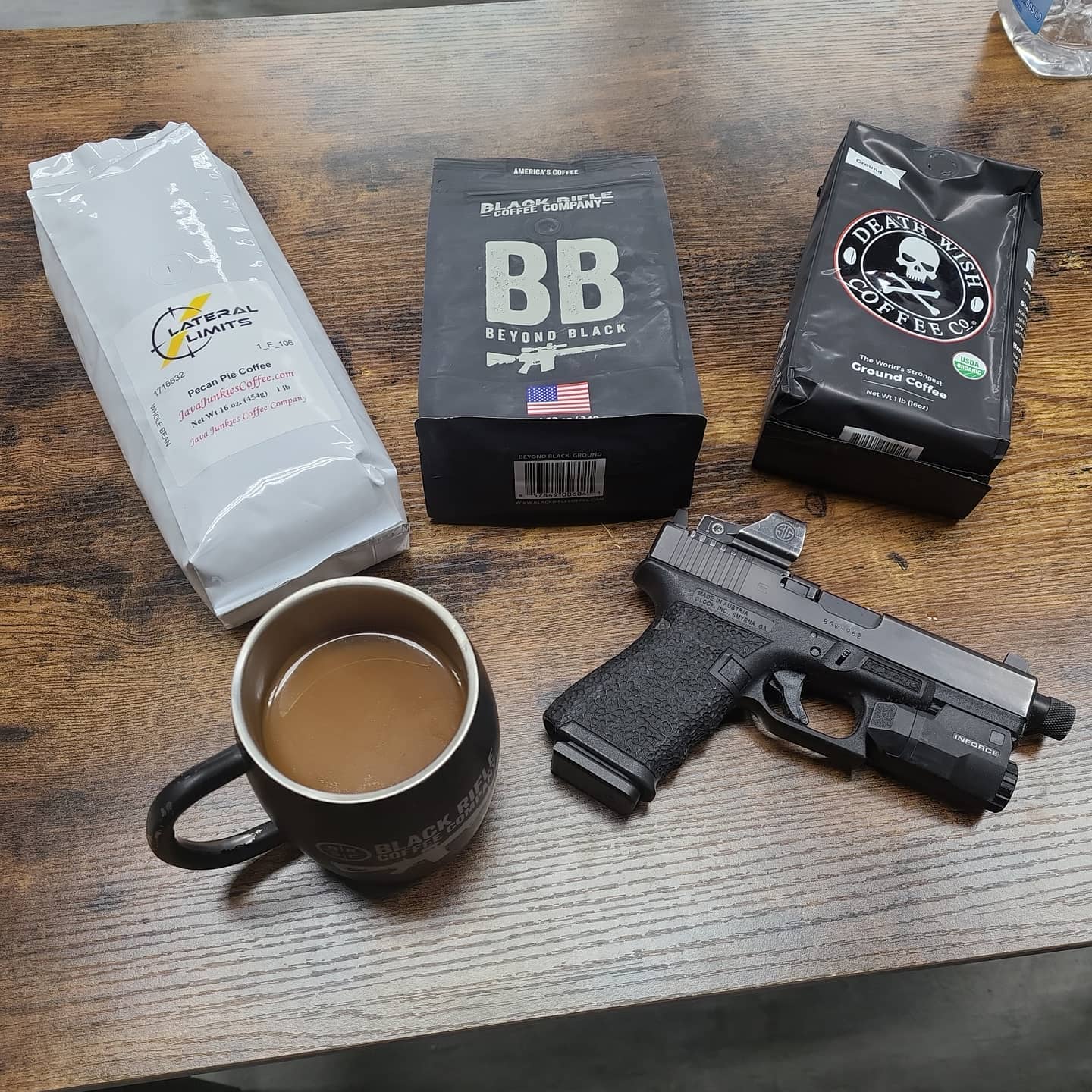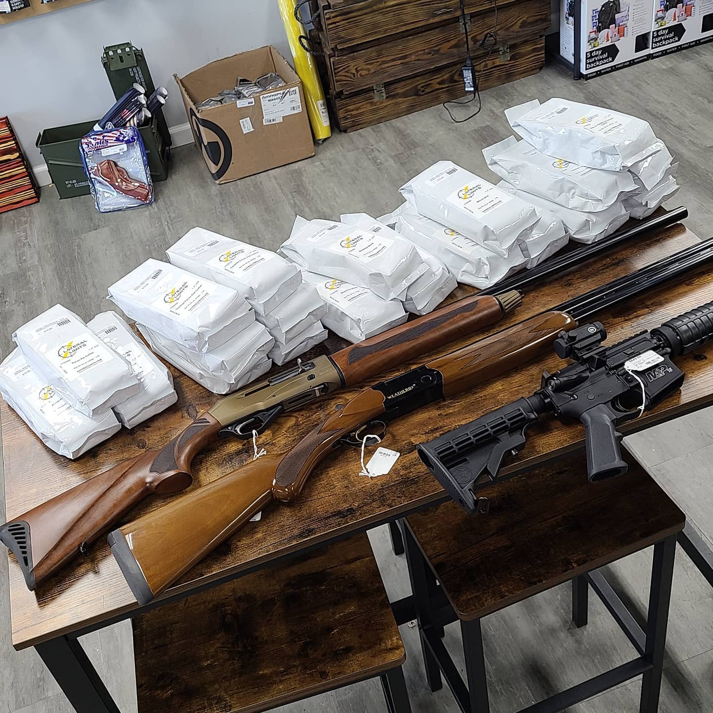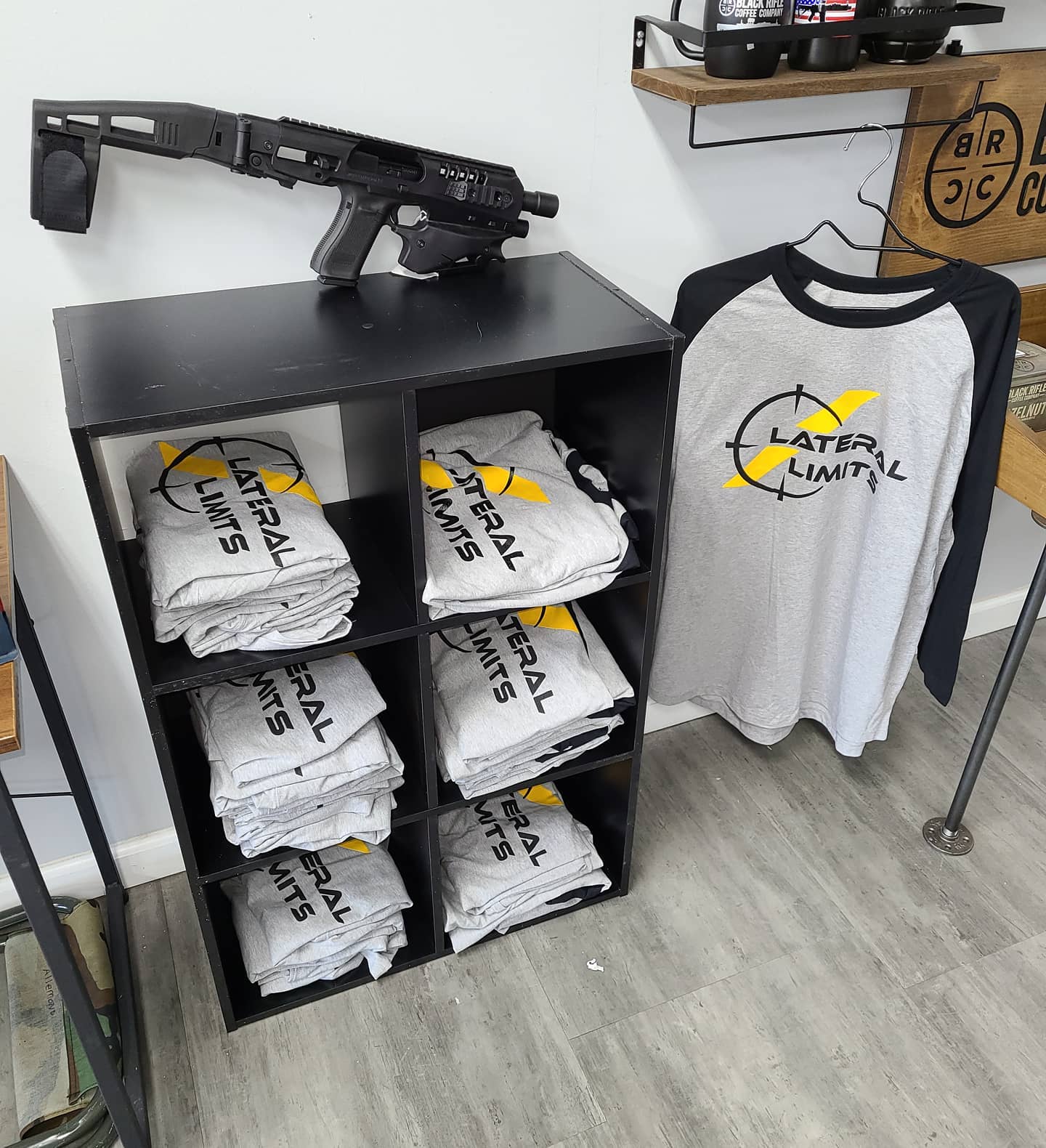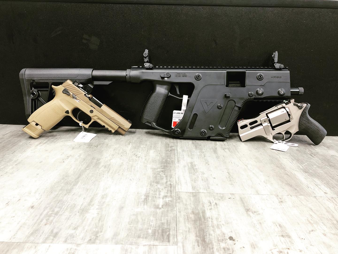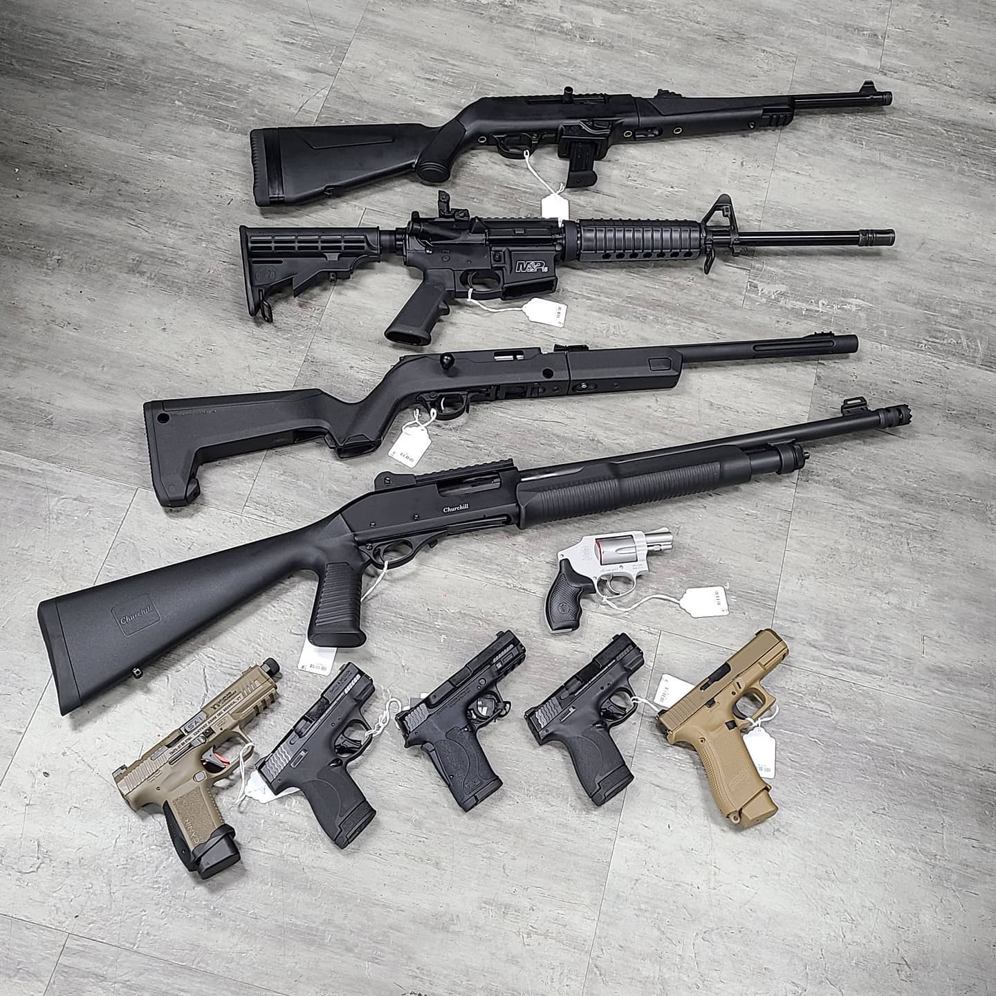 Tan and black AR-15 rifle with accessories, set on a gray wood floor.
