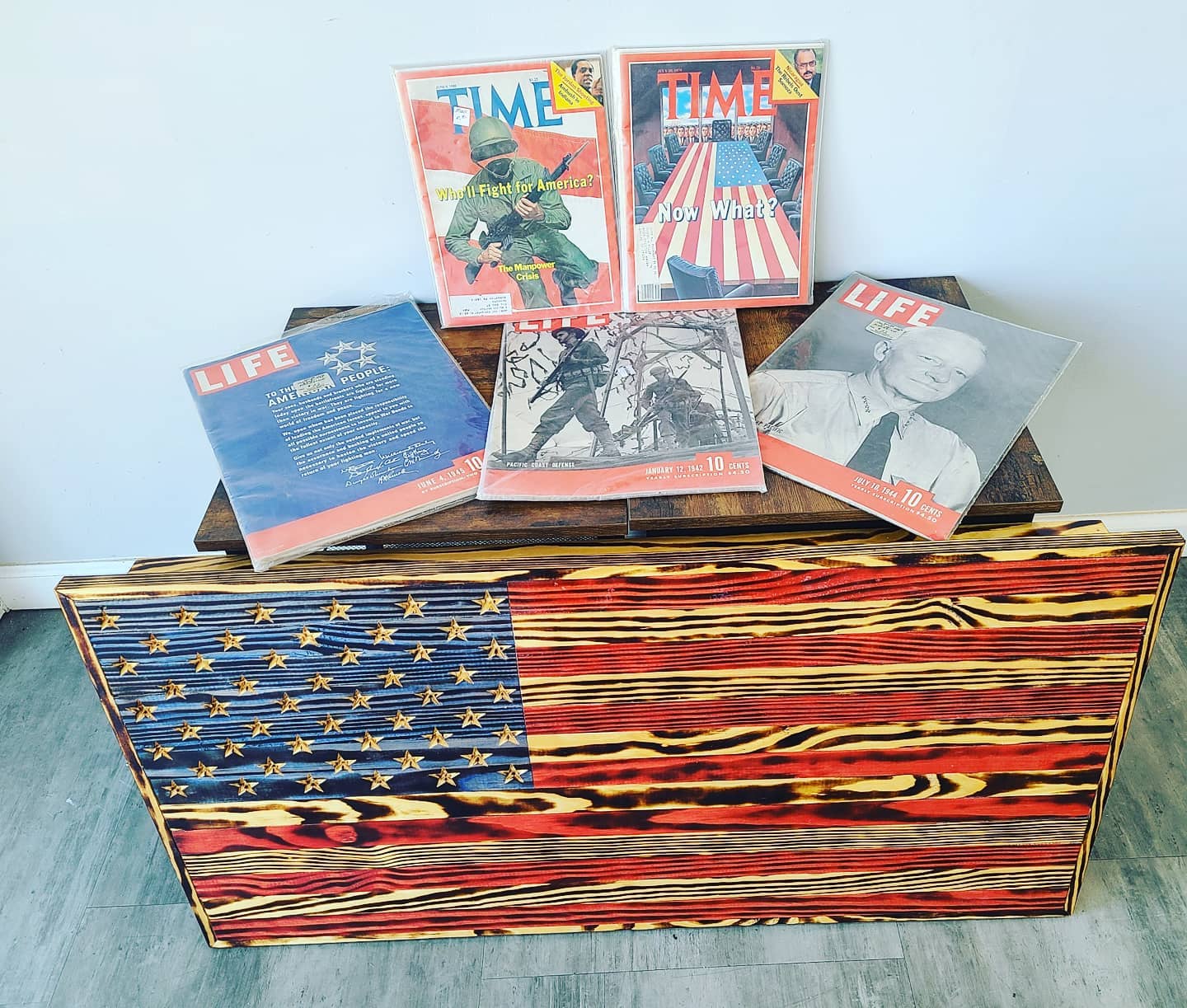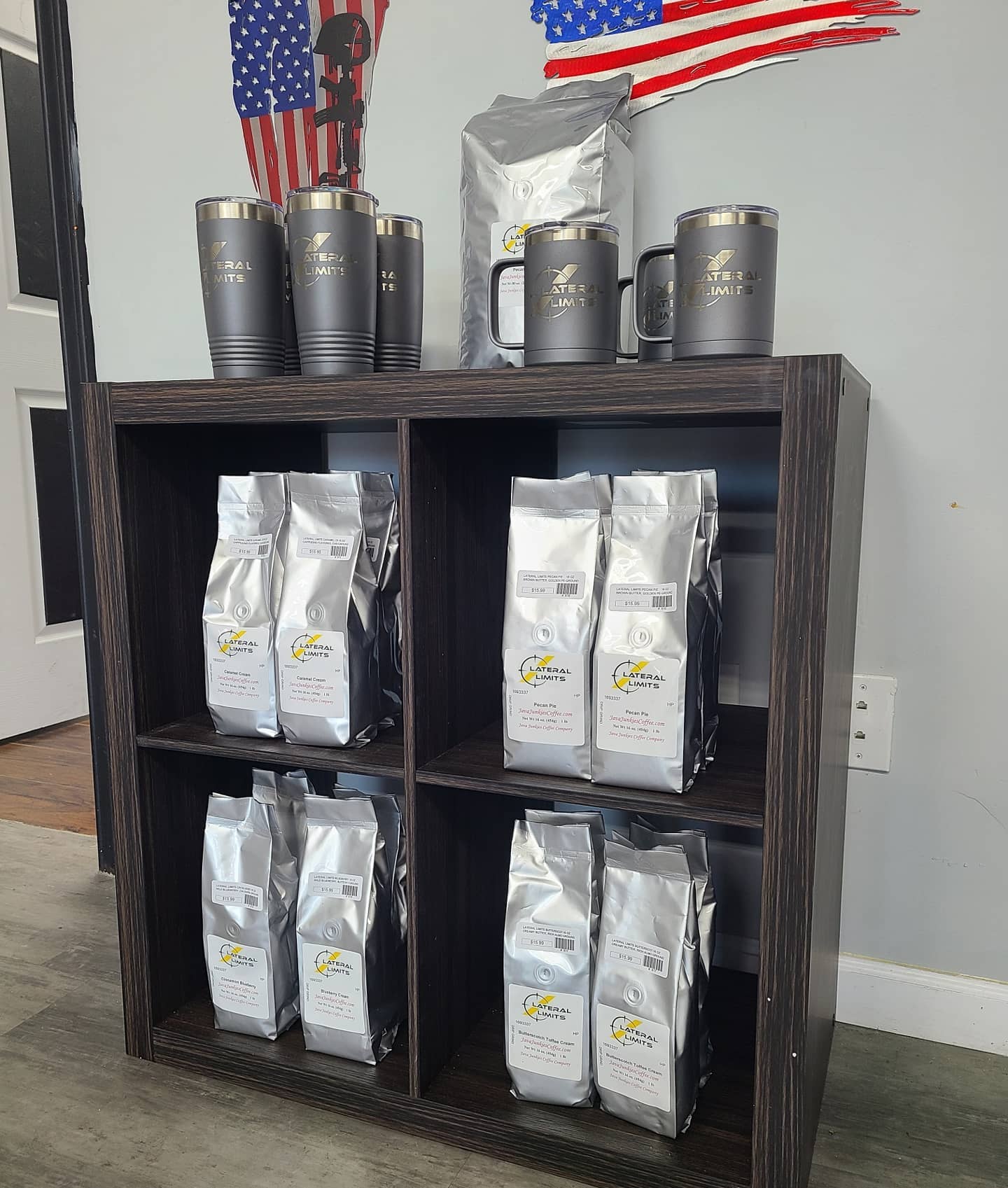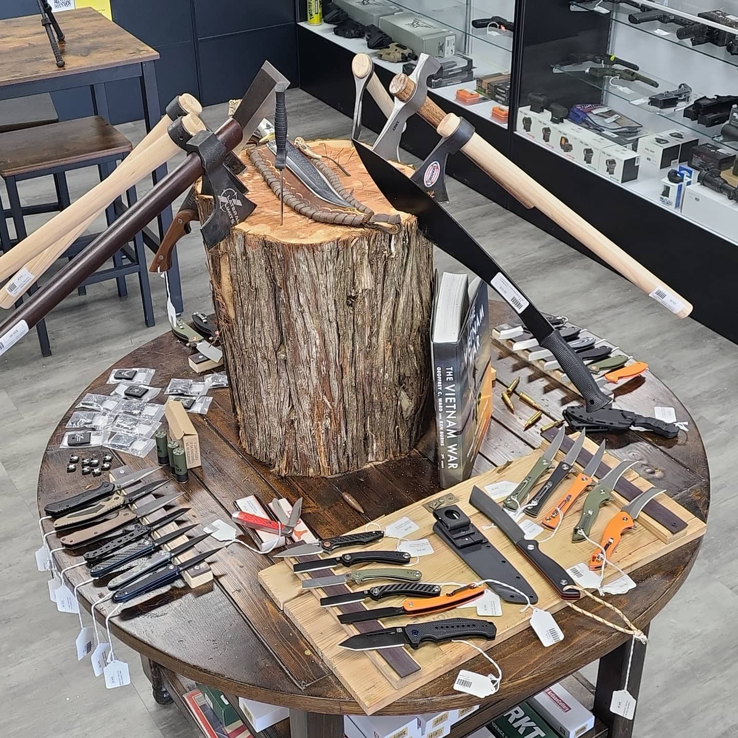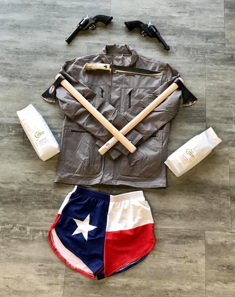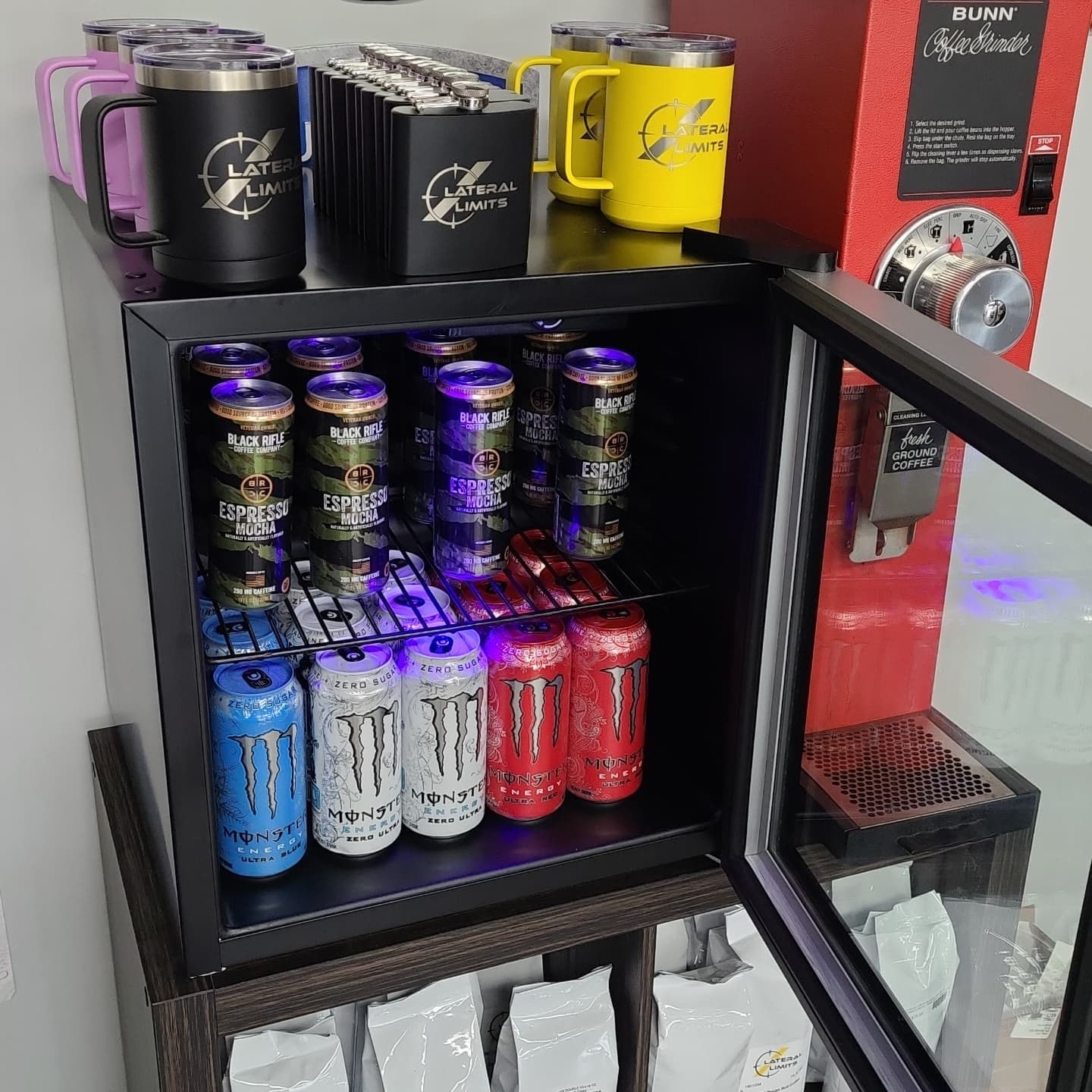 Tan and black AR-15 rifle with accessories, set on a gray wood floor.
