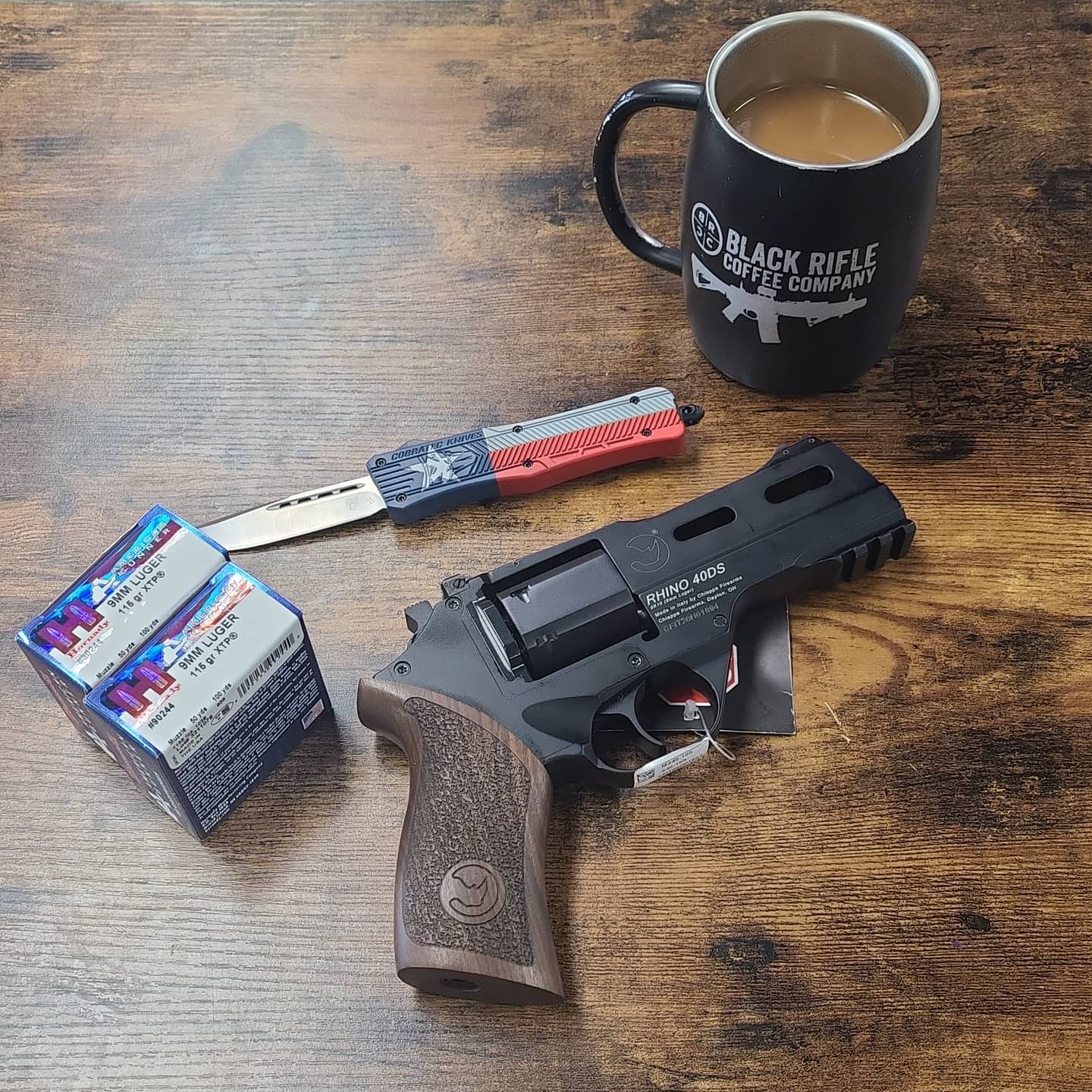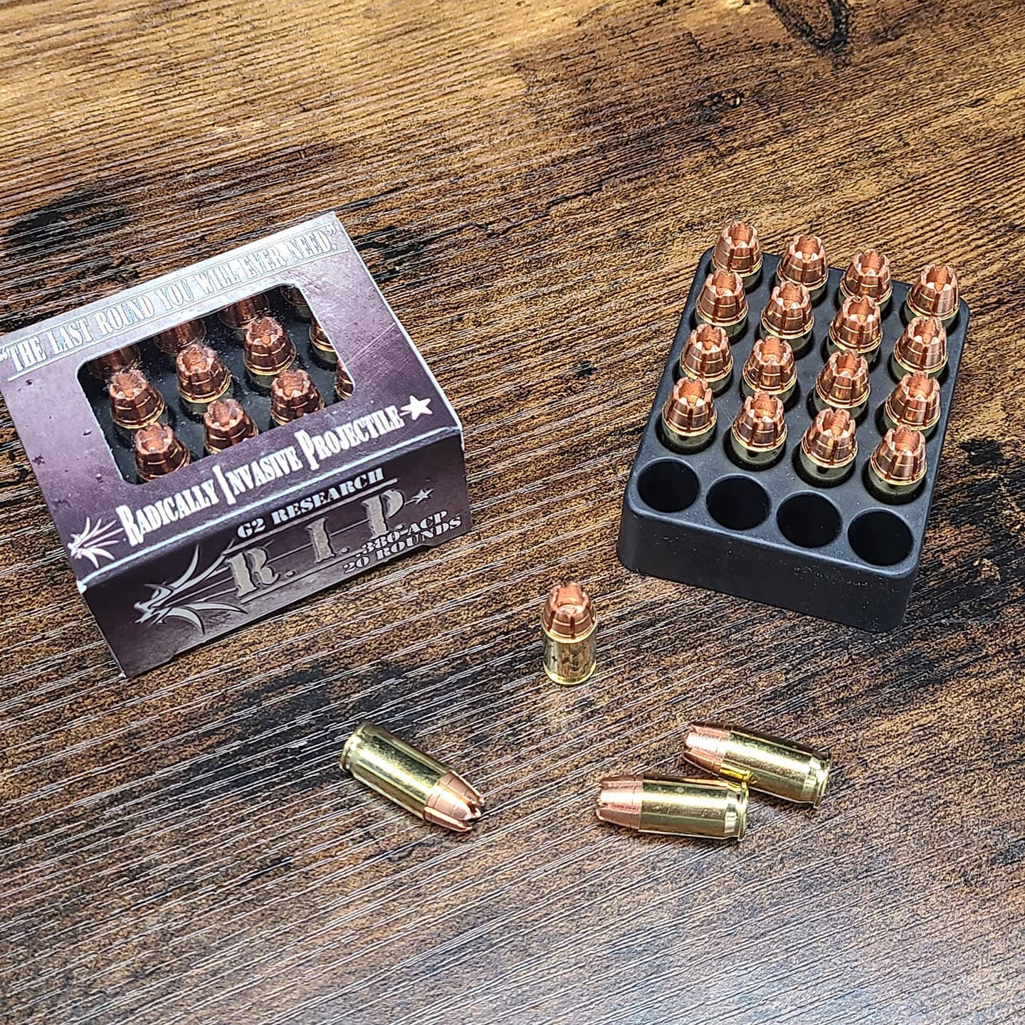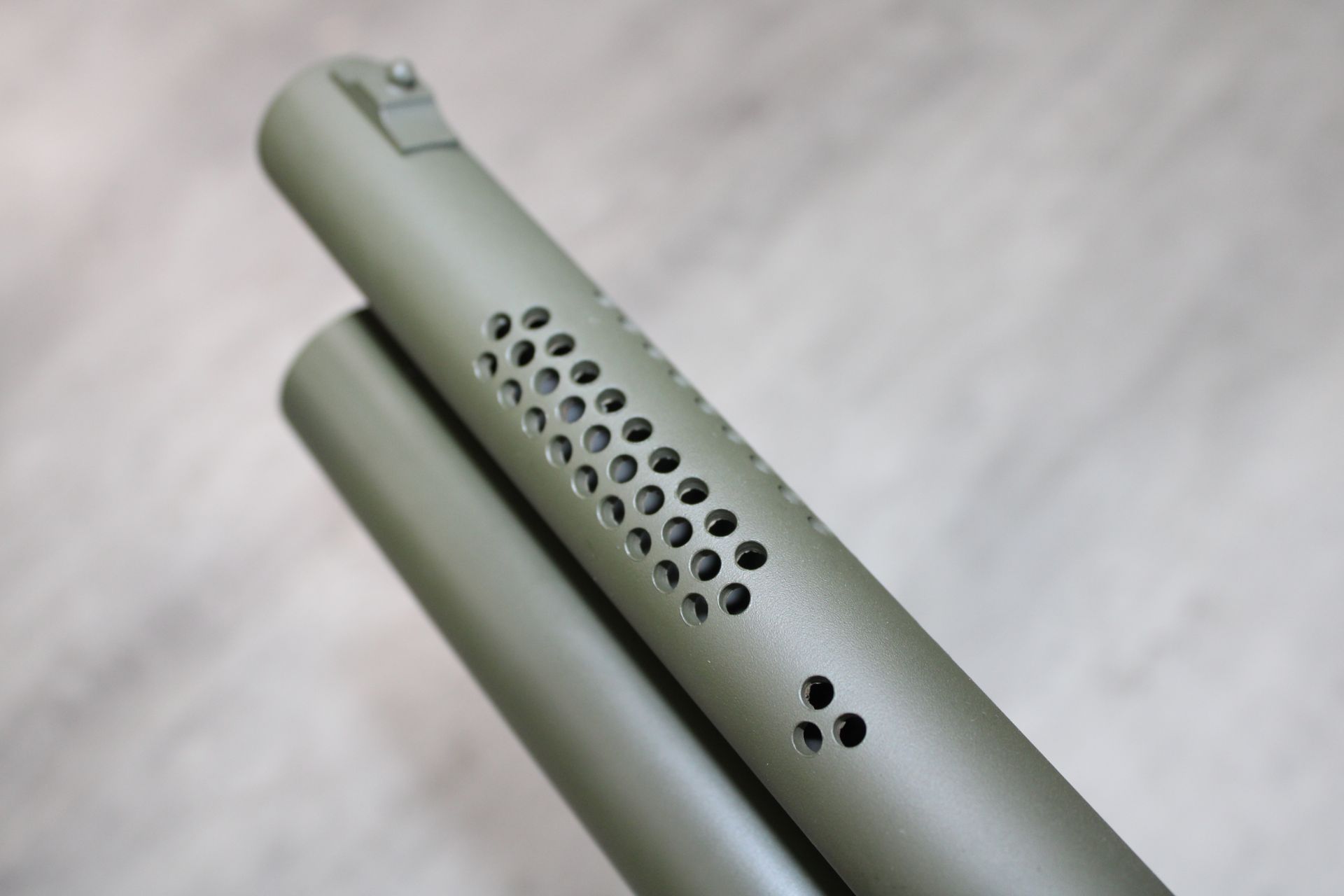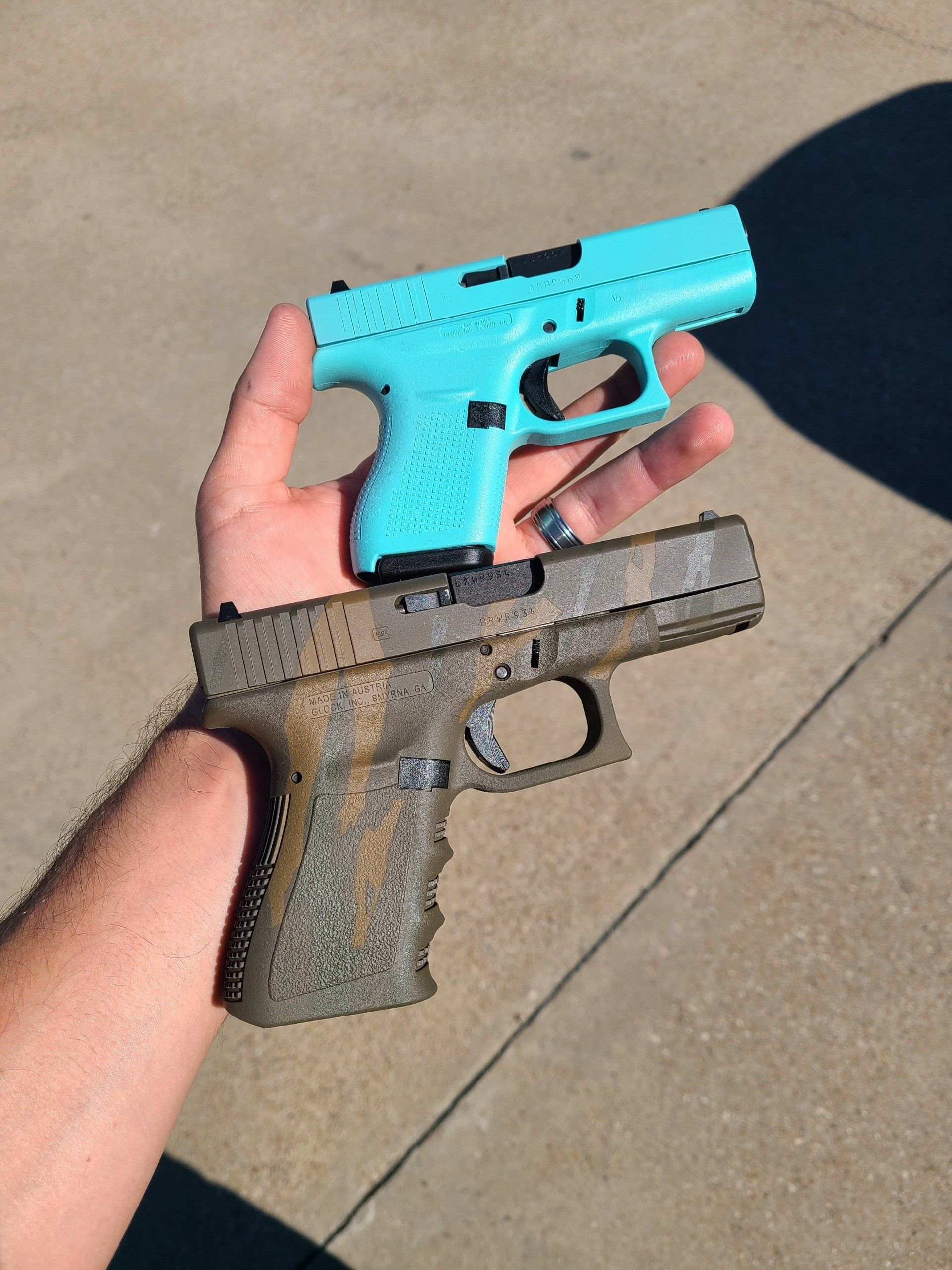 Hand holding a camouflage pistol, green front sight, with a black base.