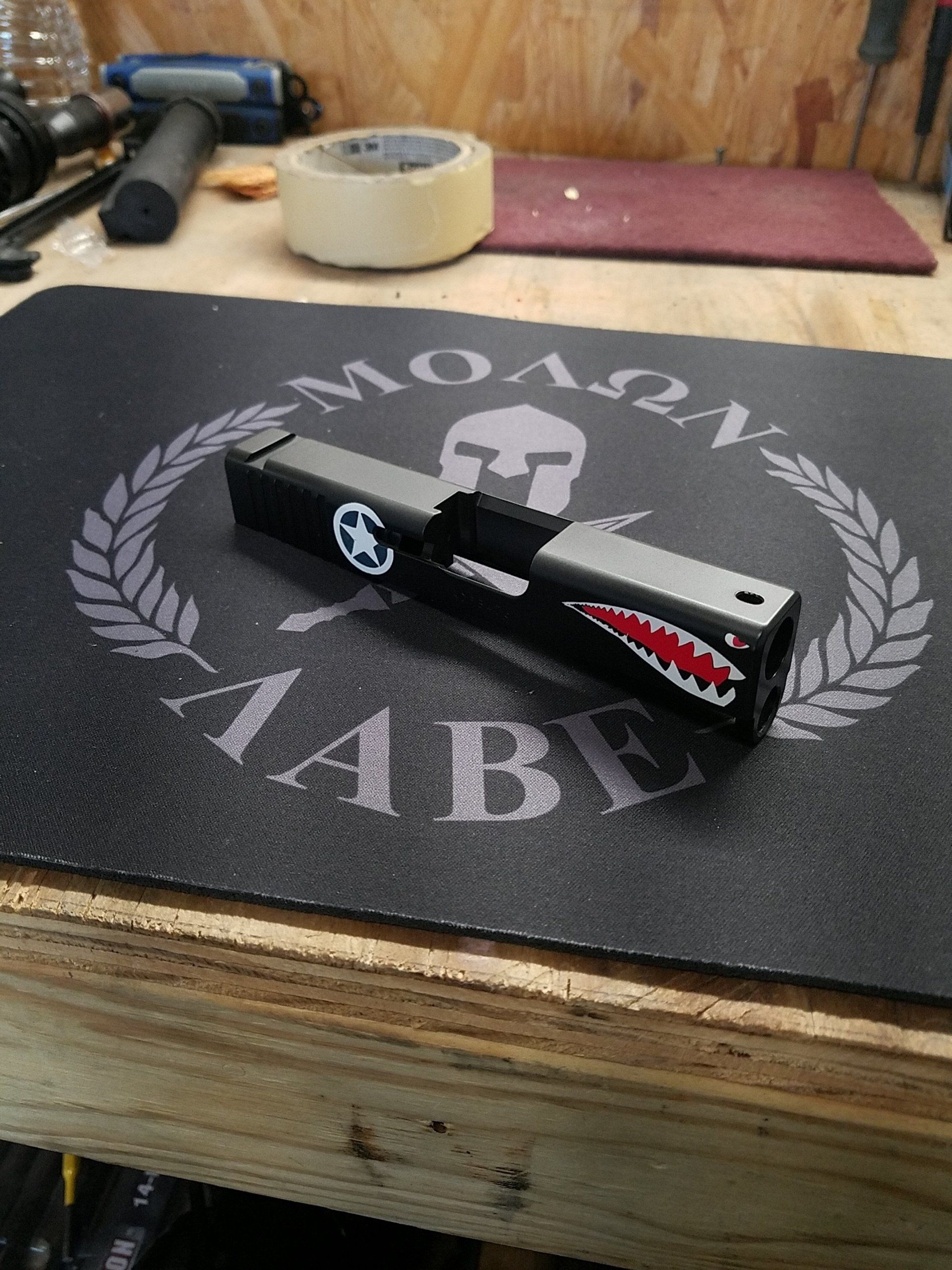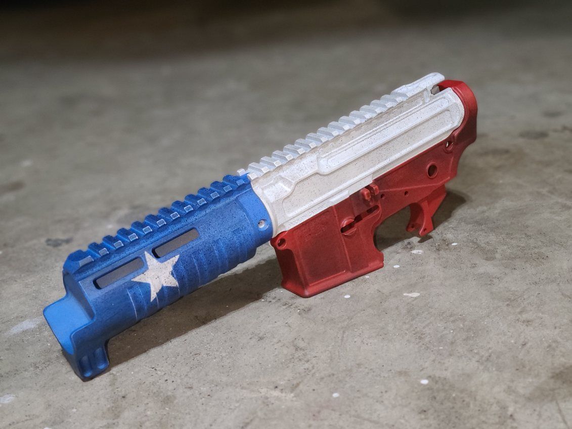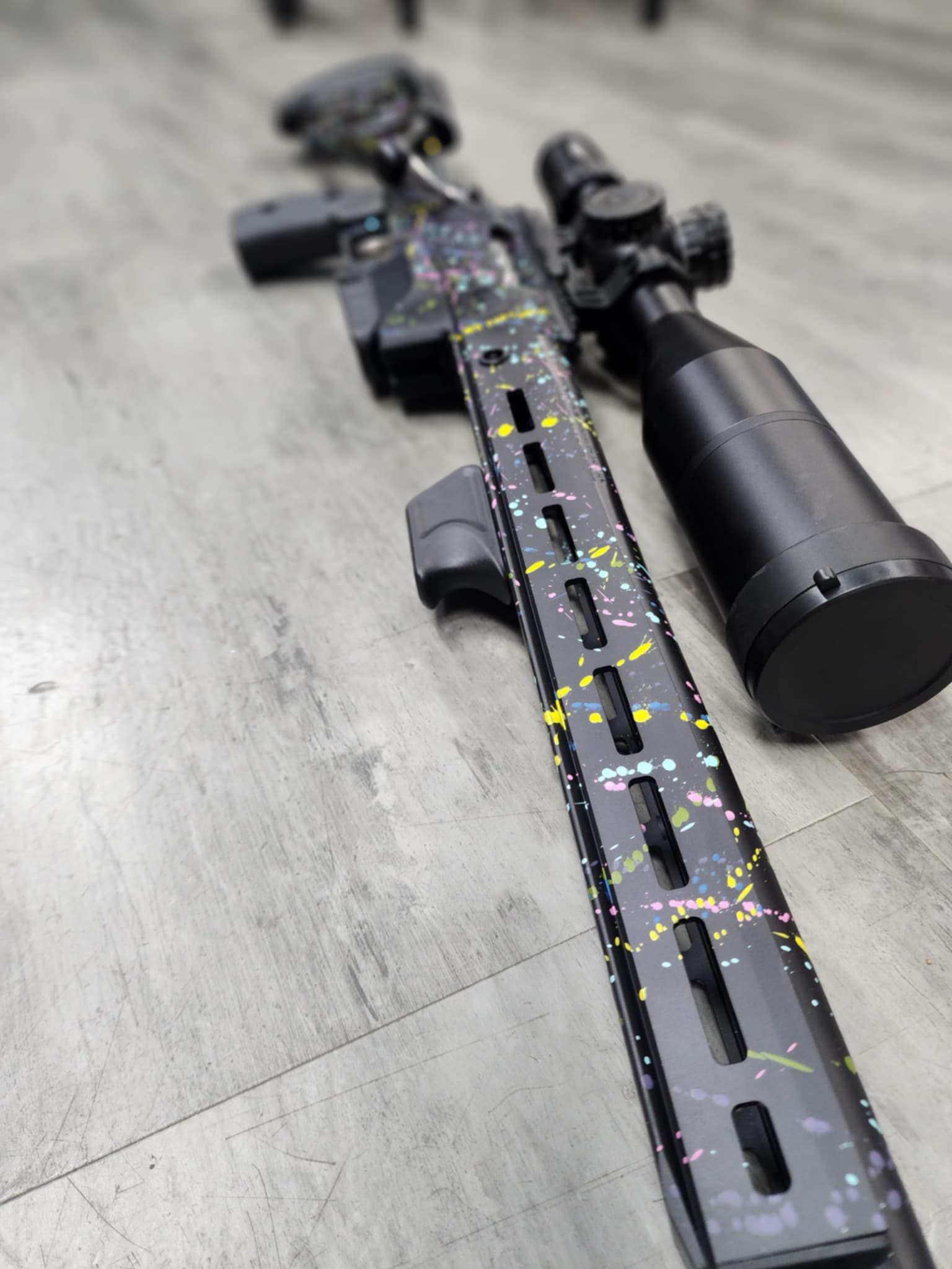 Custom painted rifle with scope, a nude figure stencil, and multi-colored splatters.