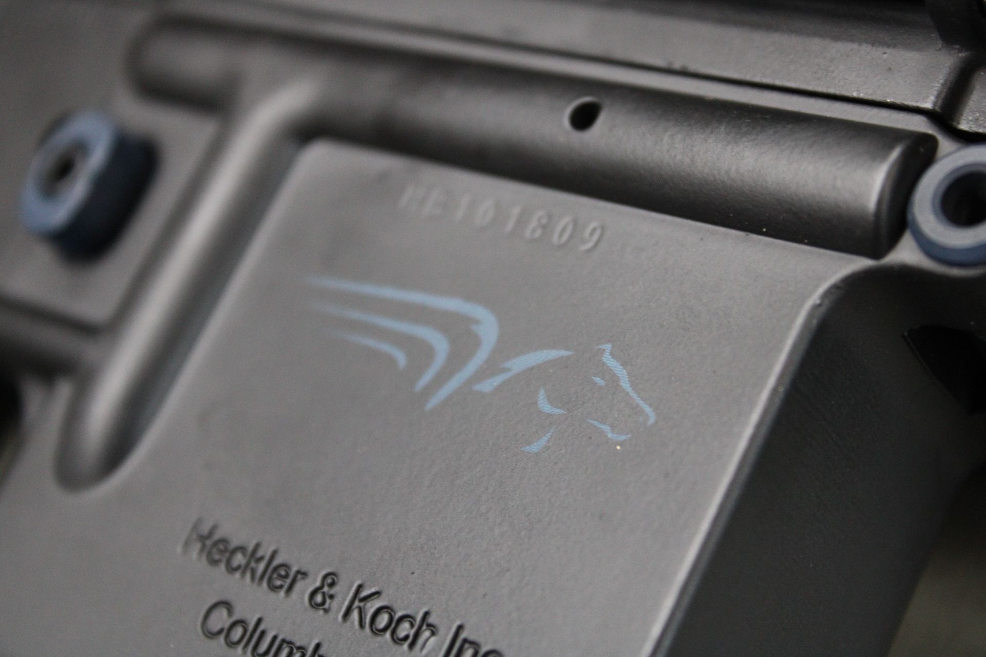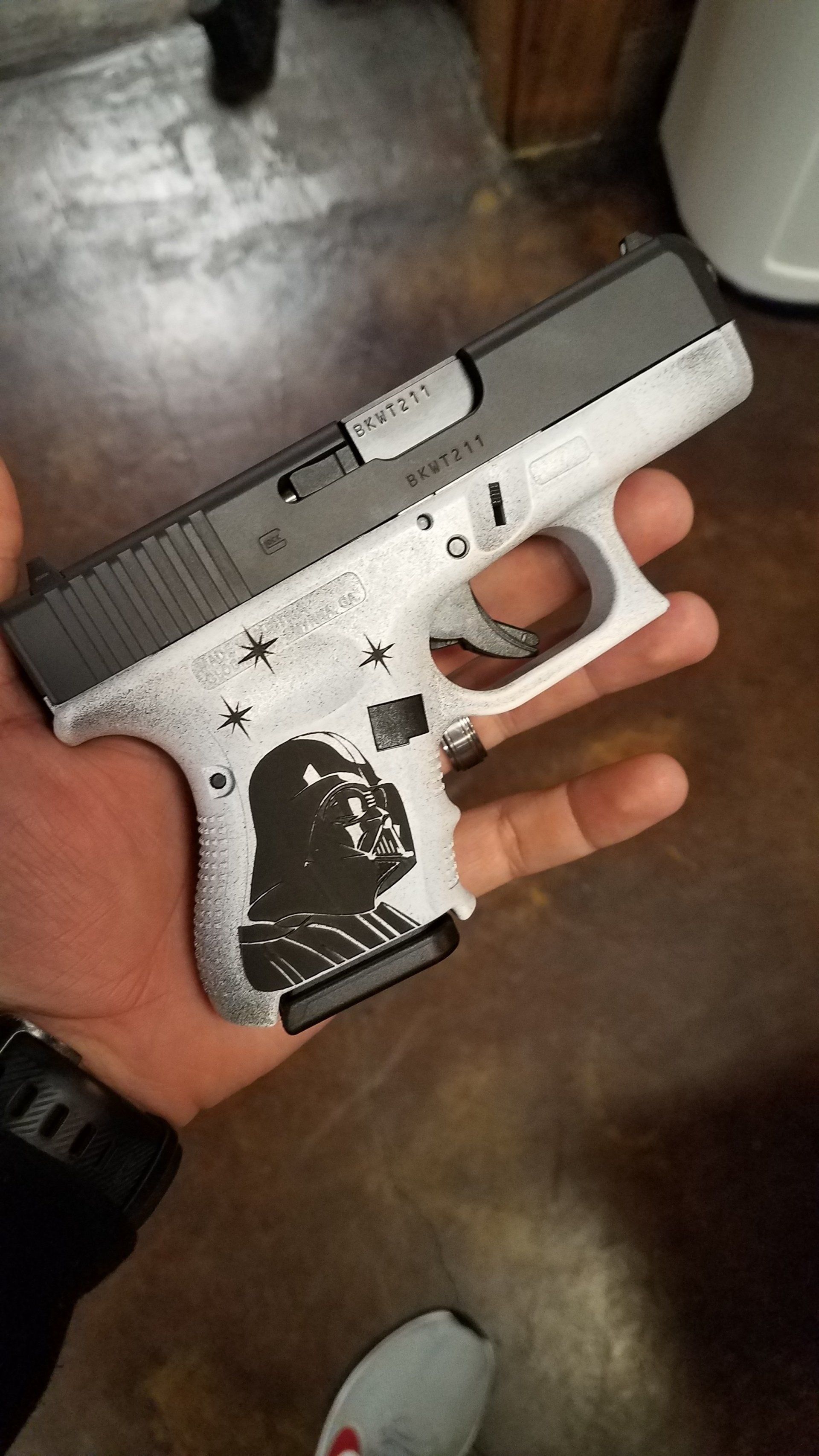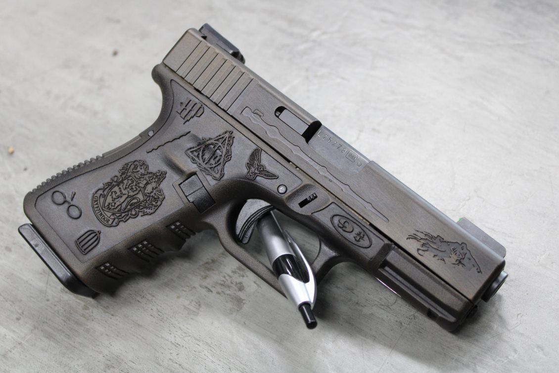 Custom painted rifle with scope, a nude figure stencil, and multi-colored splatters.
