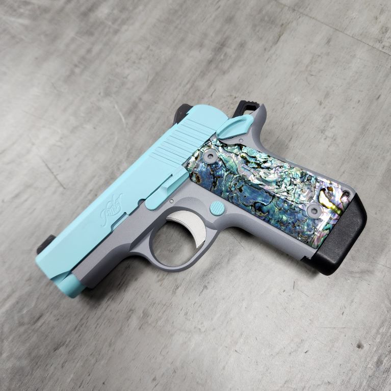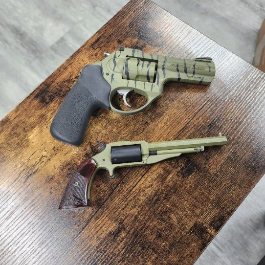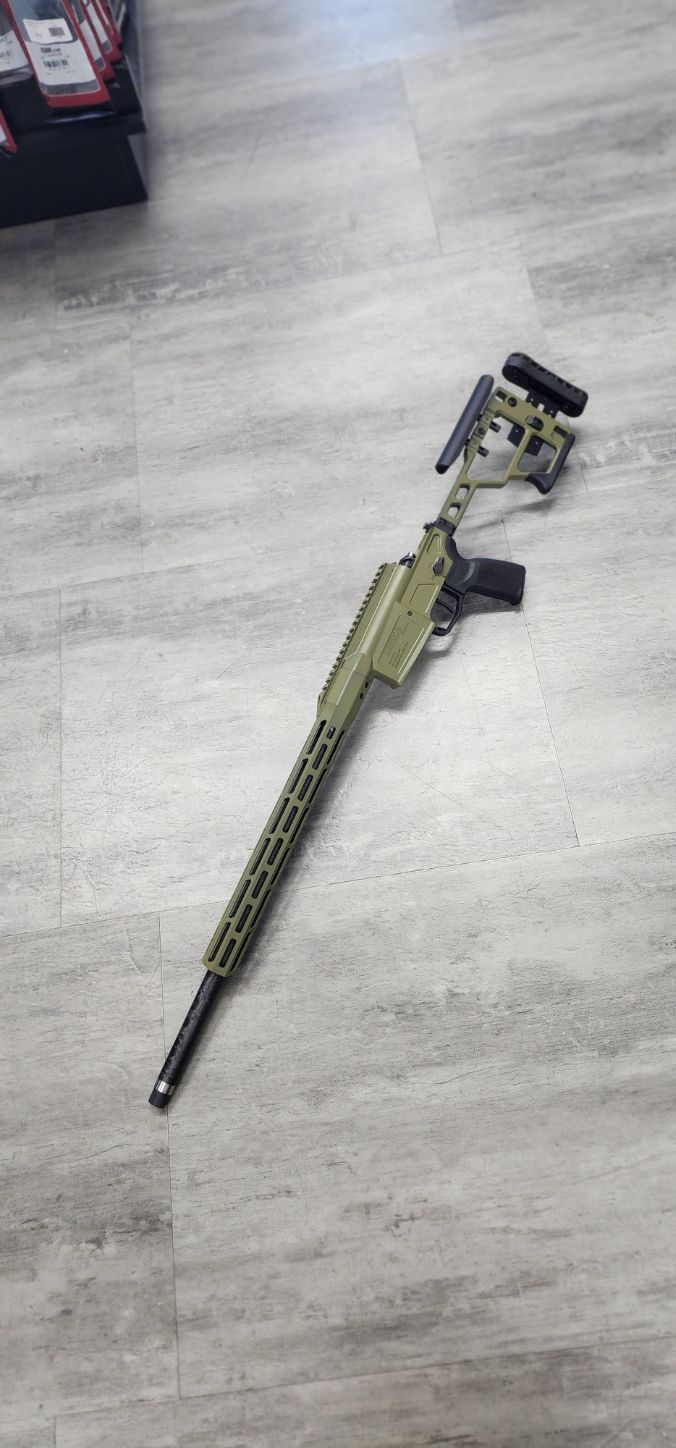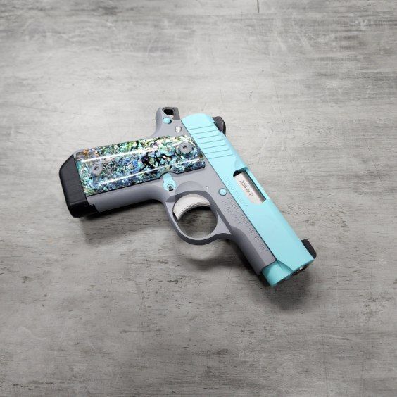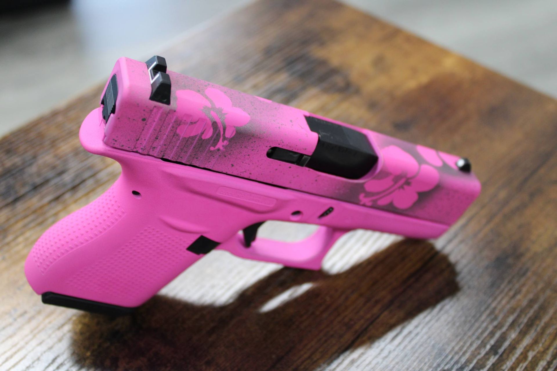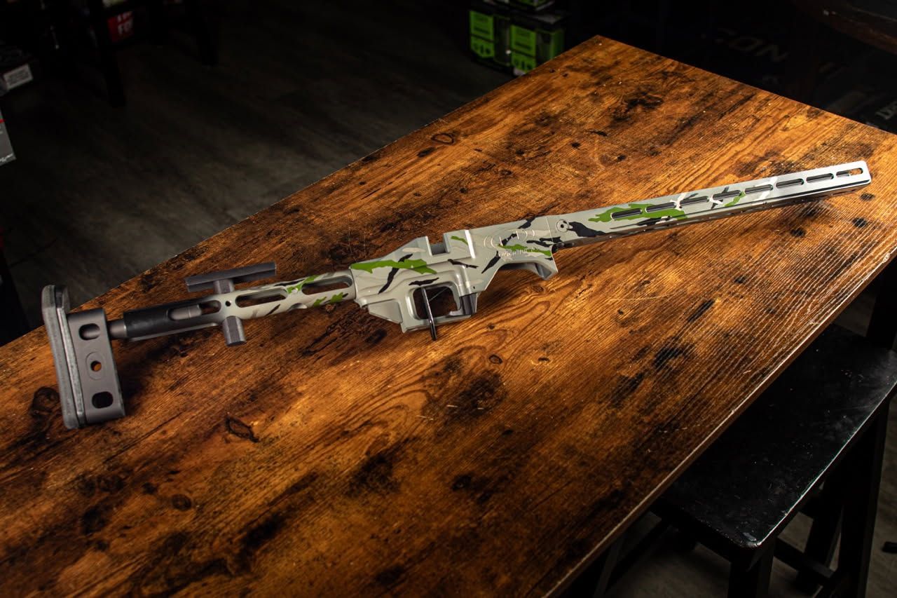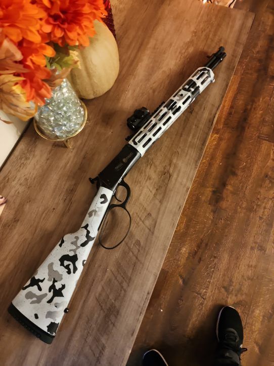 Custom-painted rifle with scope. Olive green base with splattered pink, yellow, and black design; indoor setting.